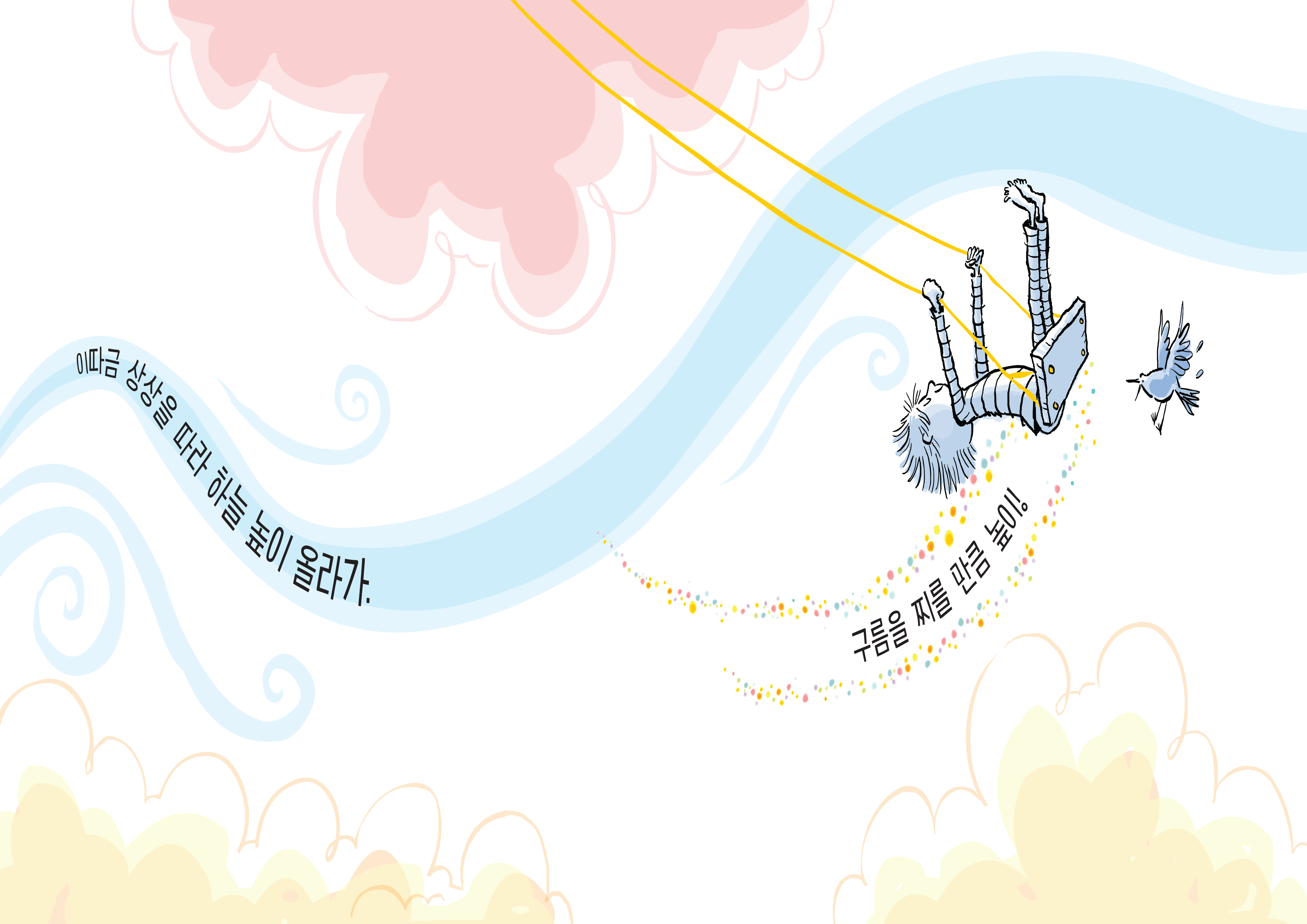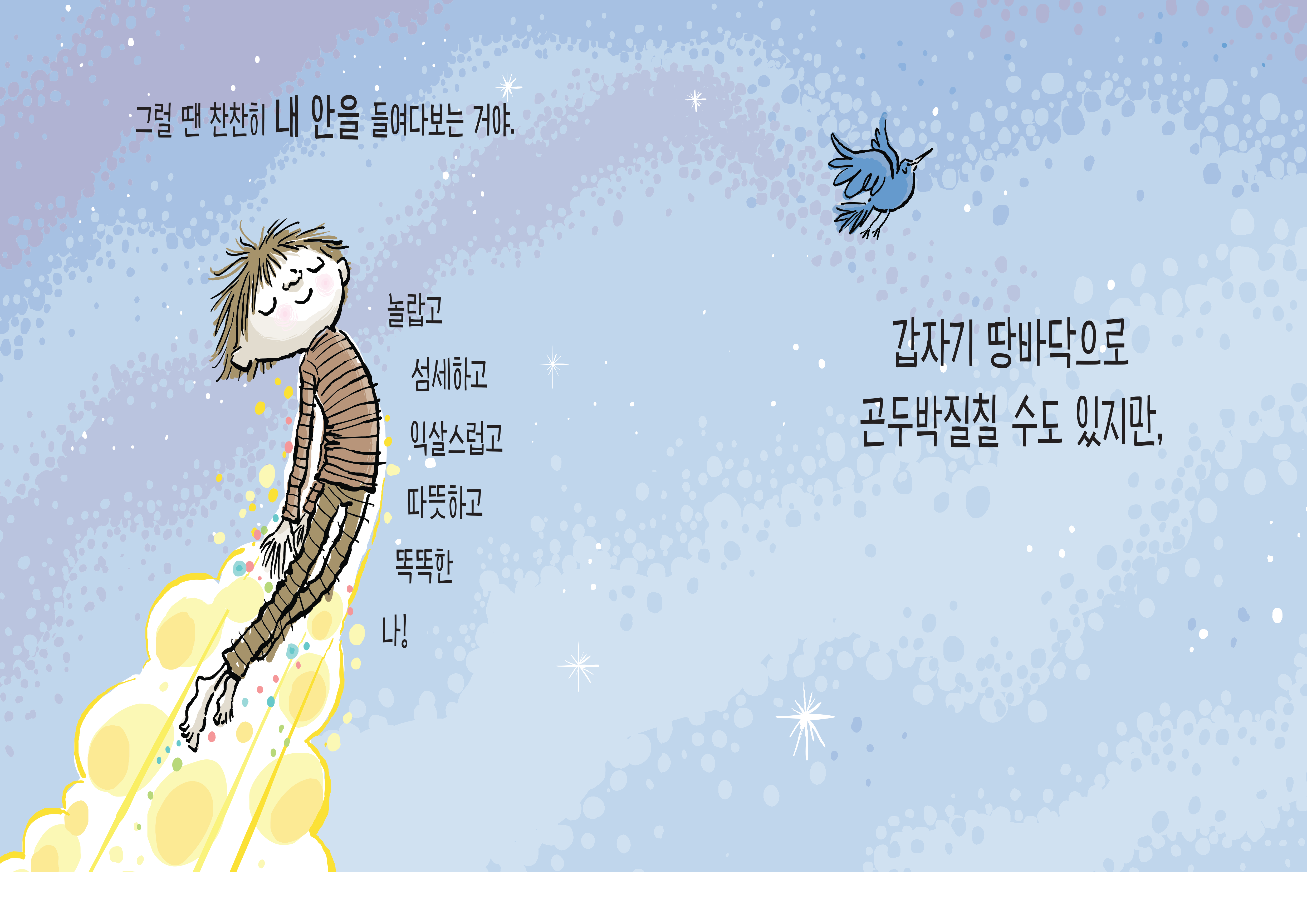 아이의 마음을 가진 화가, 피터 레이놀즈의 새 그림책 『너에게만 알려줄게』의 맨 처음 장면에서 아이는 선언합니다. “난 행복한 아이!” 어른들로부터 똑바로 앉아, 조용히 해라, 앞을 봐야지, 하는 말을 주로 듣긴 하지만 아이는 어쩔 수 없다고 고백합니다. 상상이라는 것이 언제나 불쑥 찾아오기에, 그 모든 게 마음대로 되지는 않는다고 말이죠. 이런저런, 크고 작은, 가지각색 상상이 바로 아이가 말하는 행복의 비결입니다. 상상은 때로 둠칫둠칫 음악 소리로 아이를 춤추게 하고, 하늘 높이 올라가게도, 바닥으로 곤두박질치게도 합니다. 상상을 즐기기에 딱 좋은 곳은 어지러운 방 안, 청소는 금물!
