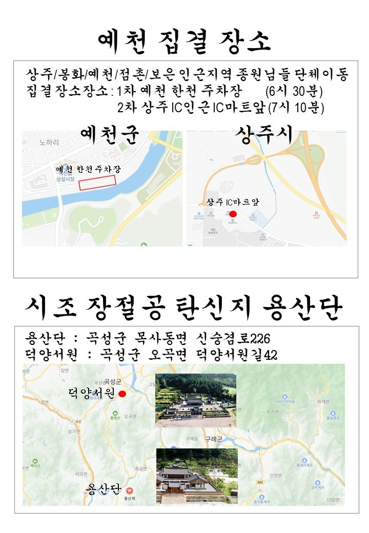 평산신씨대종중에 다녀왔는데 큰누나와 아내그리고 나는 예천 한천으로가 차를 주차해 놓고 상주,문경,예천,영주,봉화에서 모인 종원님들과 대절한 버스로 신숭겸장군탄생지인 곡성 용산단과 덕양서원을 다녀왔다