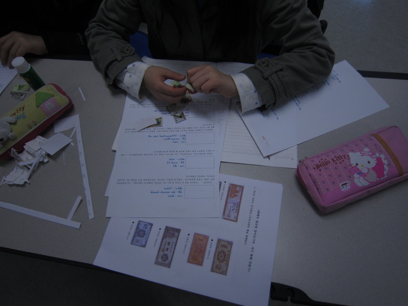 아이들과 친해지고, 별명 정하는 등등으로 첫시간 보냈구요. 두번째 시간에 현재 사용되는 돈의 종류와 도안에 들어있는 이야기들을 위주로 수업했습니다.