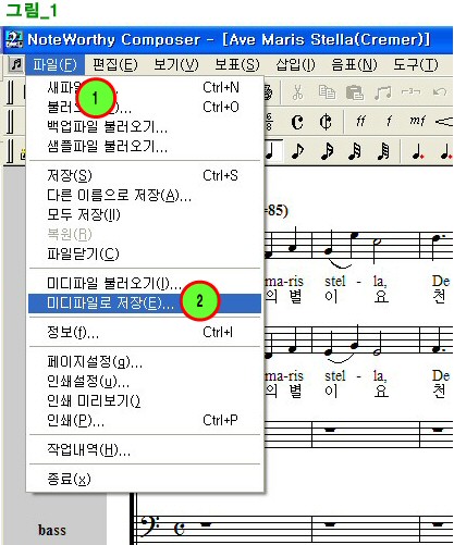 [그림_1]처럼 파일메뉴-미디파일로 저장을 선택합니다.