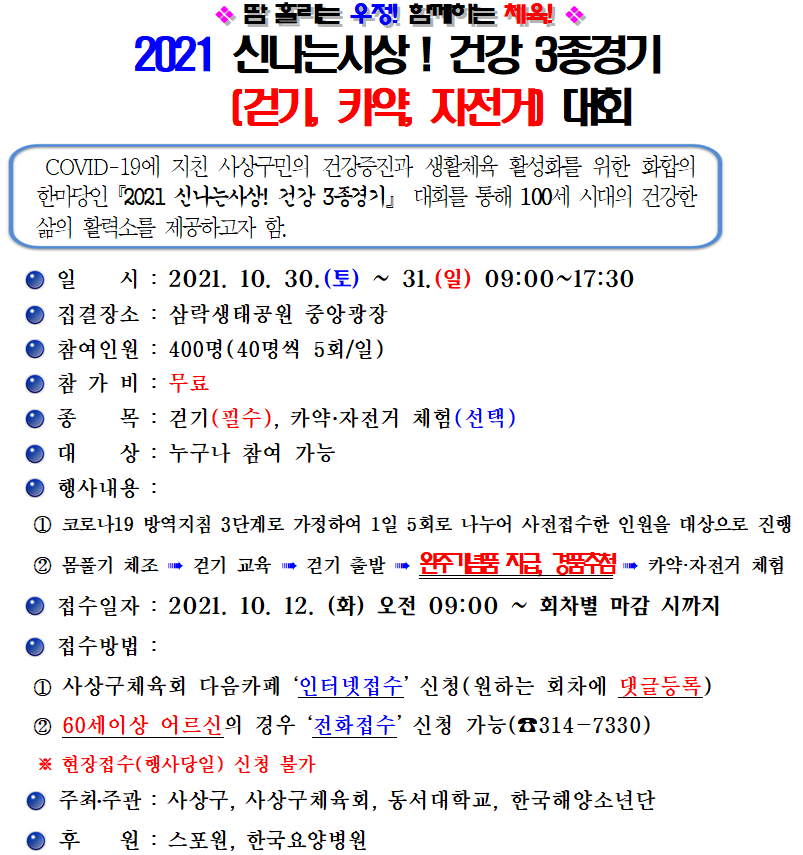 ▶신나는 사상 ! 건강 3종경기(걷기·카약·자전거) 대회 안내문◀ 작성자서민규|작성시간21.10.06|조회수1,611 목록 댓글 3 글자크기 작게가 글자크기 크게가 다음검색 현재 게시글 추가 기능 열기 북마크 공유하기 신고 센터로 신고 댓글 댓글 3 댓글쓰기 답글쓰기 댓글 리스트 해당 댓글은 작성자와 운영진만 볼 수 있습니다. 해당 댓글은 작성자와 운영진만 볼 수 있습니다. 작성자열성 | 작성시간 21.10.29 12시 참여해도 될까여 댓글 전체보기
