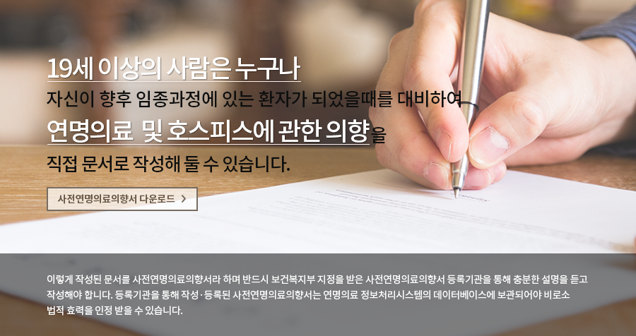 사전연명의료의향서는 19세 이상이면 건강한 사람도 작성해 둘 수 있습니다. 다만 보건복지부가 지정한 사전연명의료의향서 등록기관을 찾아가 충분한 설명을 듣고 작성해야 법적으로 유효한 서식이 됩니다.