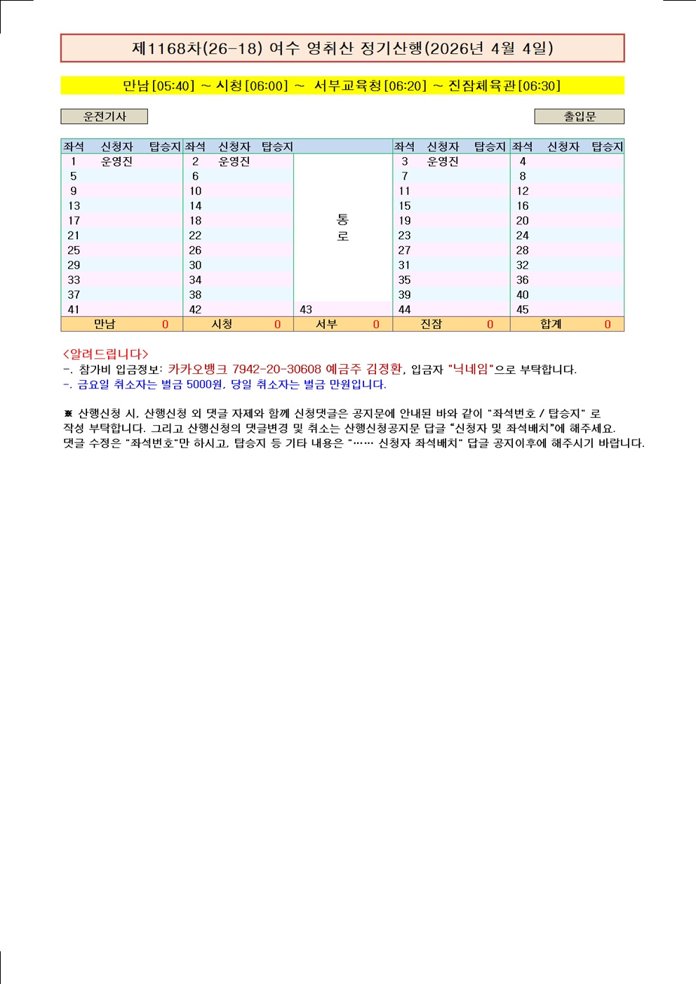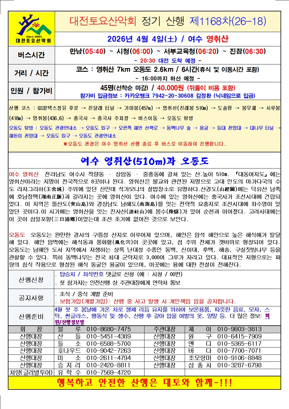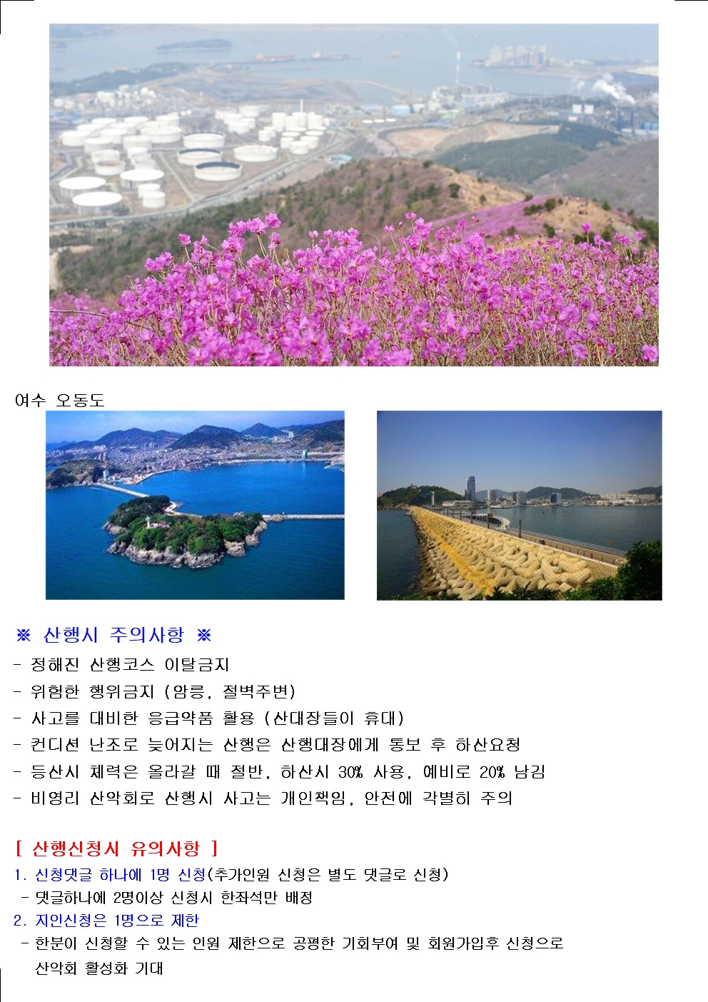 비가 와도 산행을 합니다. 우중산행을 대비하여 방수 자켓 또는 우비 준비하셔야 합니다.