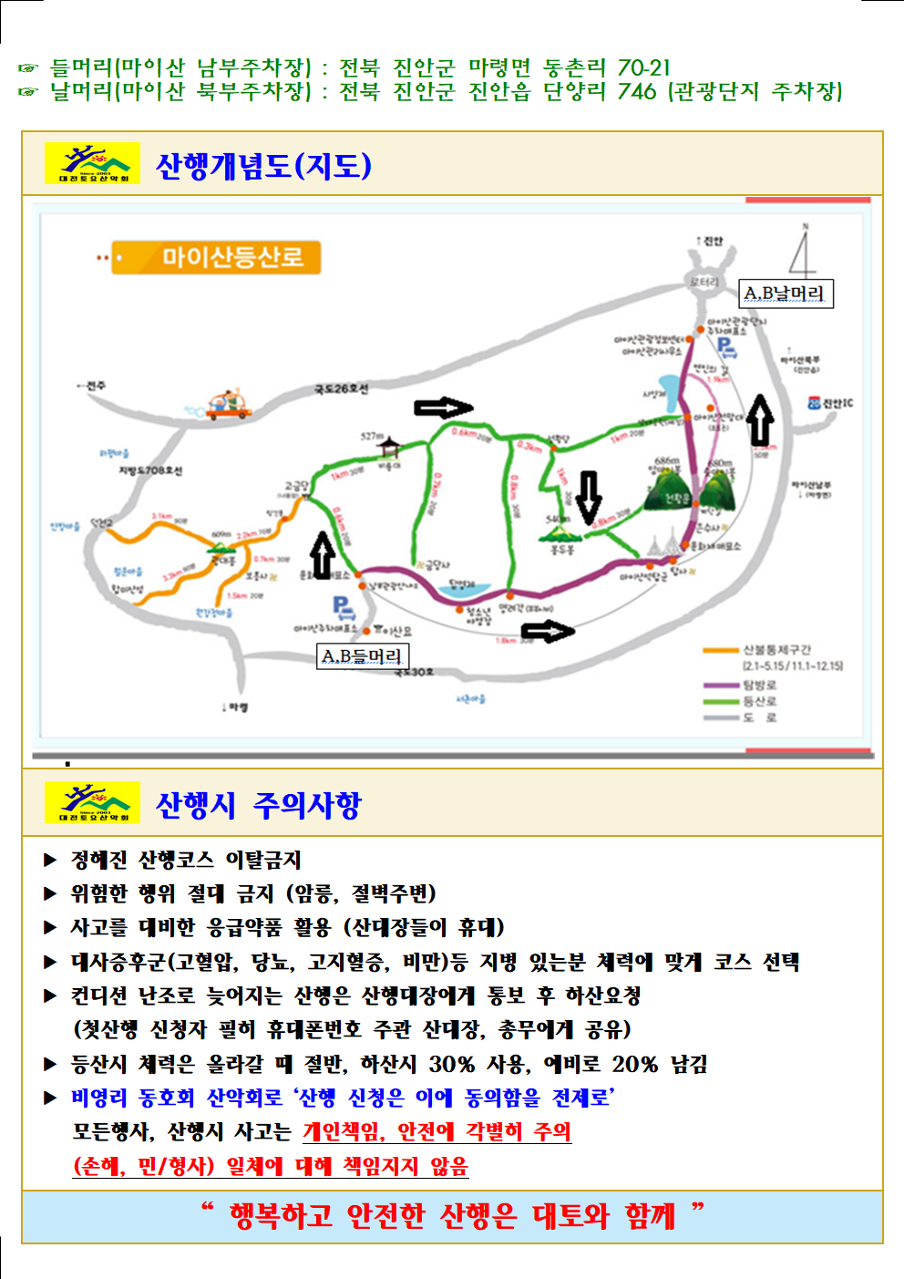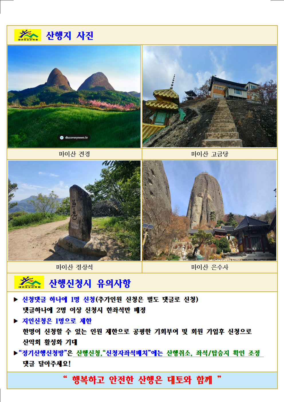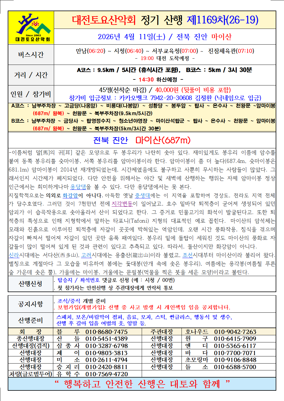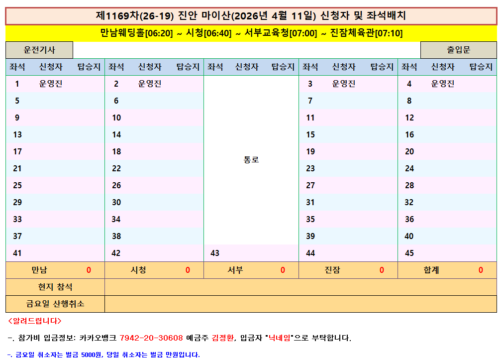 제1169차(26-19)전북 진안 마이산 산행 공지문(2026.04.11) 작성자호나우드|작성시간26.04.05|조회수1,076 목록 댓글 46 글자크기 작게가 글자크기 크게가 다음검색 현재 게시글 추가 기능 열기 북마크 공유하기 신고 센터로 신고 댓글 댓글 46 댓글쓰기 답글쓰기 댓글 리스트 작성자여름향기. | 작성시간 26.04.10 38/진잠 작성자산들. | 작성시간 26.04.10 현재 빈자리~(43)번 남았습니다.**이번 (주말ㆍ일요일)에 날씨도 너무좋고 마이산 벚꽃이 만개되어 멋진 산행이 될것같네요~^^ 작성자마린보이 | 작성시간 26.04.10 참석 21 서부교육청 작성자산들. | 작성시간 26.04.10 진잠/43. 답댓글 작성자알미 | 작성시간 26.04.10 드디여 신청을~~~ 댓글 전체보기