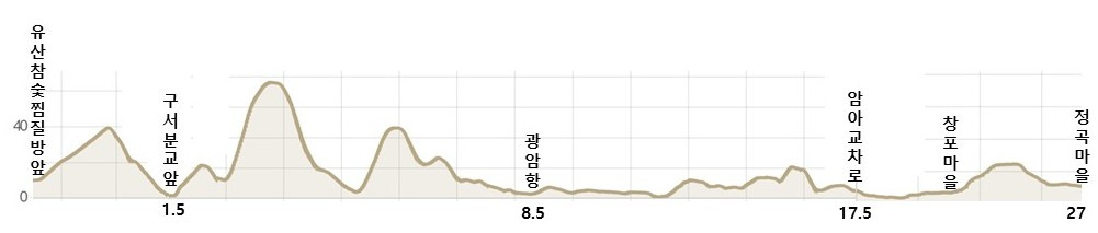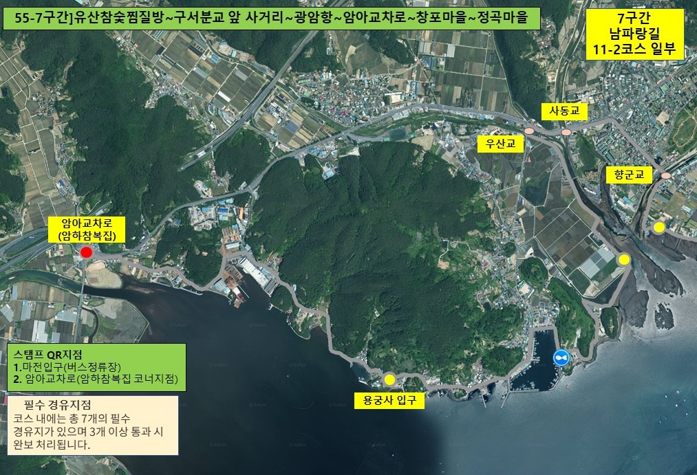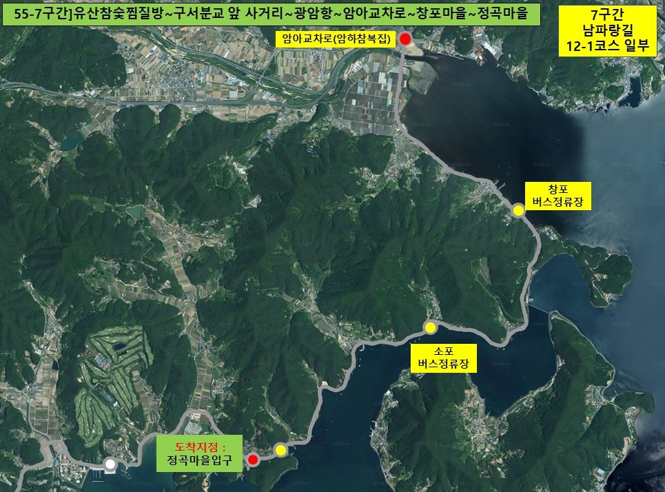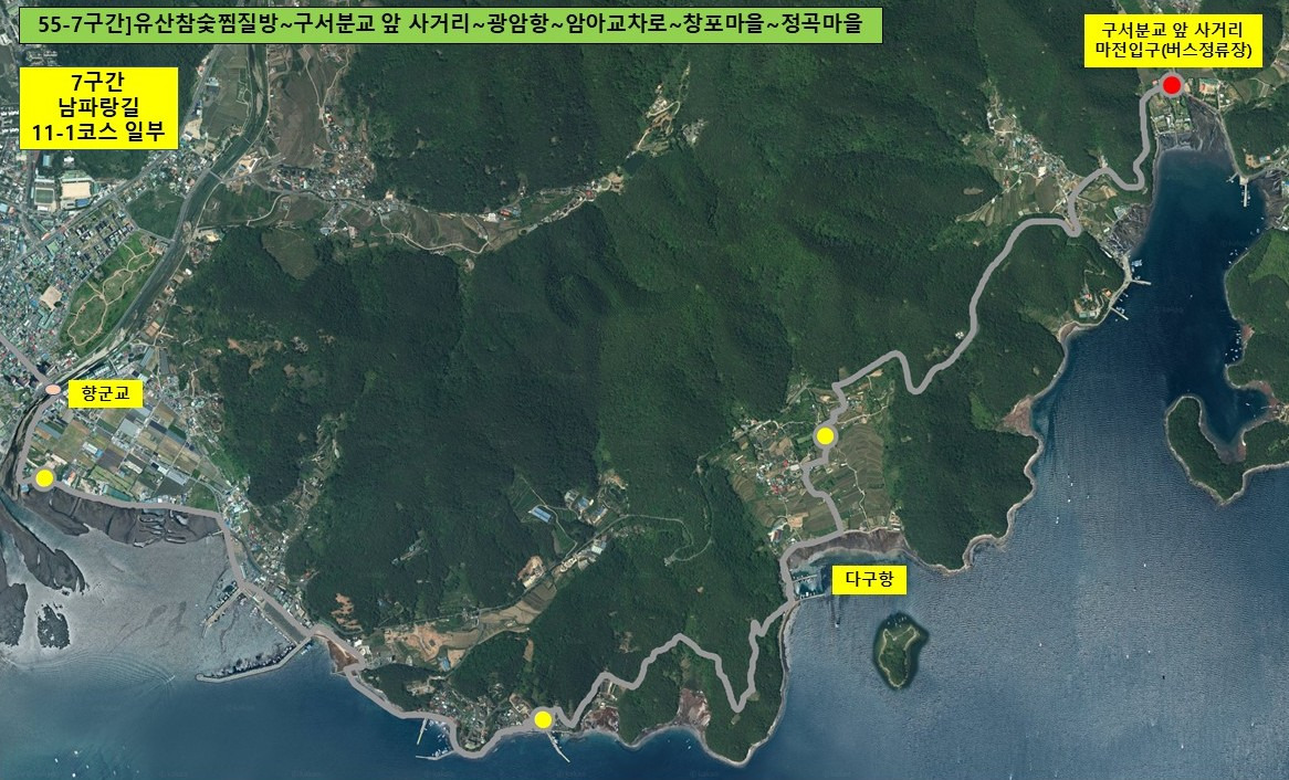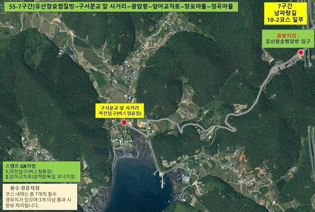 유산 참숯찜질방~2.0Km-구서분교 앞 사거리-7.0Km-광암항-1.5Km-삼진119안전센터-7.5Km-