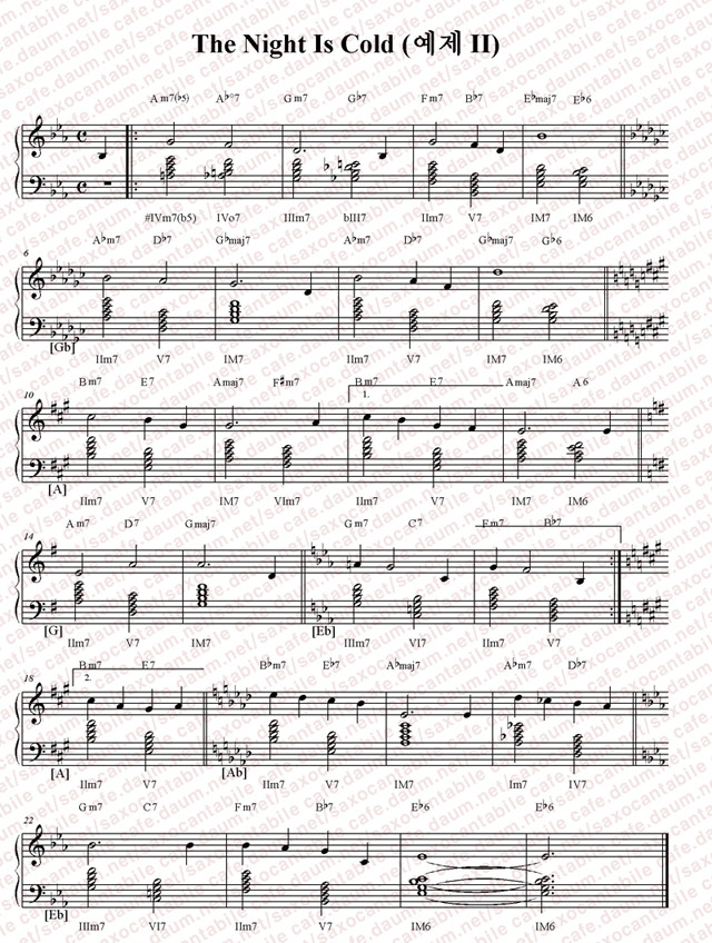 다음 악보는 [강좌 09]의 The Night Is Cold 예제 I을 편곡한 예제 II입니다.