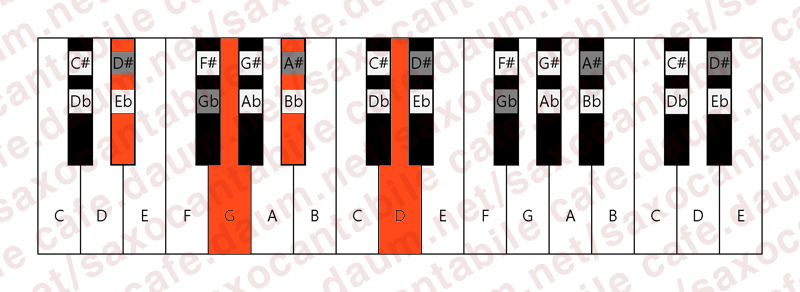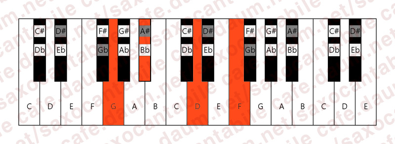 위의 첫번째 그림은 위의 예제 악보에서 IM7에 해당되는 EbM7 코드입니다. 두번째 그림은 IIIm7인 Gm7 코드입니다. EbM7의 구성음은 Eb - G - Bb - D입니다. Gm7의 구성음은 G - Bb - D - F입니다. 두 코드의 구성음들 중에 3 개의 음이 공통된 음을 가집니다.