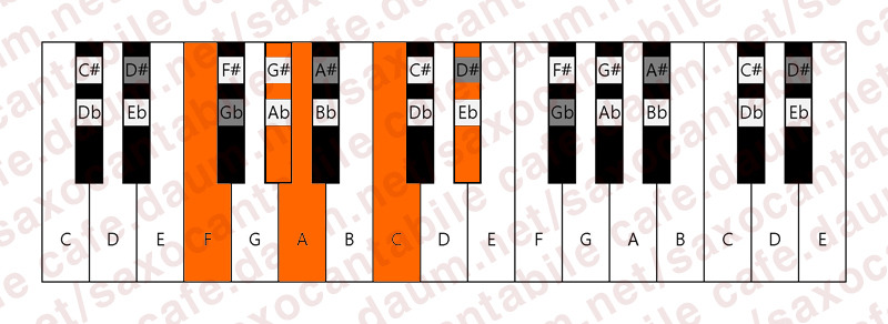 위의 첫번째 그림은 위의 예제 악보에서 IIm7에 해당되는 Fm7 코드와 F7 코드를 겹쳐 놓은 것입니다. 두번째 그림은 #IVφ7 인 Aφ7 코드입니다. Fm7/F7의 구성음은 F - Ab(A) - C - Eb입니다. Aφ7의 구성음은 A - C - Eb - G입니다. 두 코드의 구성음들 중에 Fm7의 경우에는 2 개, F7의 경우에는 3 개의 공통된 음을 가집니다. 따라서 대체가 가능한 코드가 되는 것입니다.