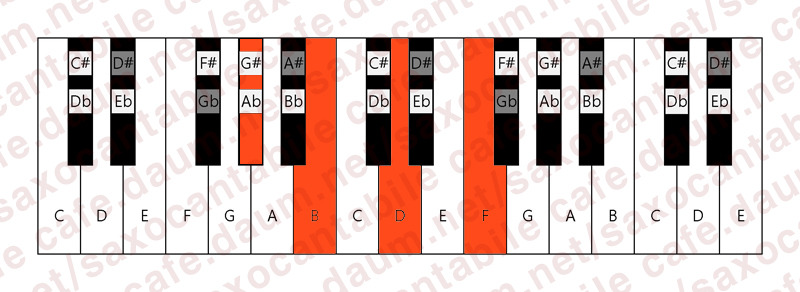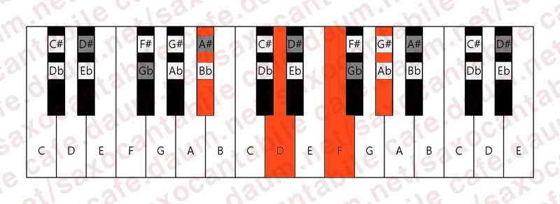 위의 첫번째 그림은 위의 예제 악보에서 V7에 해당되는 Bb7 코드입니다. 두번째 그림은 IVo7(IV diminished 7th)인 Abo7 코드입니다. Bb7의 구성음은 Bb - D - F - Ab입니다. Abo7의 구성음은 Ab - B - D - F입니다. 두 코드의 구성음들 중에 3 개의 음이 공통된 음을 가집니다.
