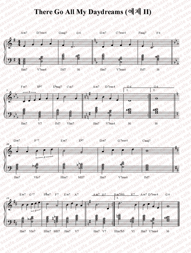 다음 악보를 보십시오. [강좌 11]에서 나왔던 There Go All My Dreams 예제 I를 편곡한 예제 II입니다.