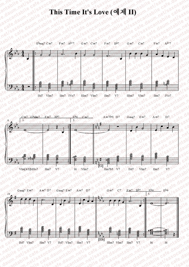 아래 악보는 [강좌 09]에 있는 This Time It's Love 예제 I을 IVo7 대리코드와 IIIm7 대리코드를 이용해서 편곡한 악보입니다.