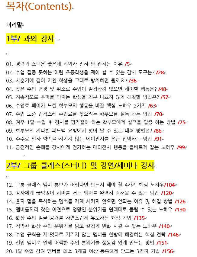 저의 강사 활동 경험을 베이스로 프리랜서 강사분들이 상대방과의 관계에서 우위에 놓일 수 있는 20 가지 처세술로 구성되어 있습니다.