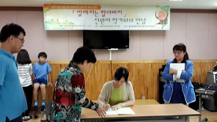 내용:발레하는 할아버지 신원미 작가와의 만남을 통해서 예술,그림,시.사진,문화 함께 할 수 있는~~ 통습형 인재가 됄 수 있는~~~ 목표와 꿈을 이룰 수 있는~~~ 동기부여와 인지능력을 주시면서 행동으로 실천 할 수 있는 일기장의 매력, 쓰는 이유을 일깨워 주신 훌륭한 작가와의 만남을 가졌습니다.가족의 기다림 치유 됄 수 없는 아품을 알고