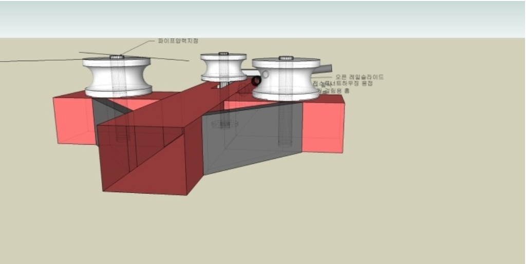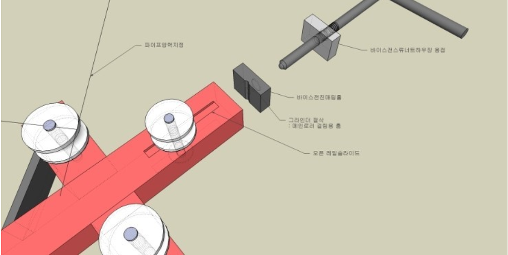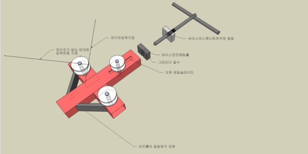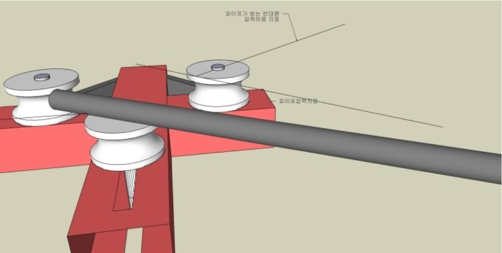 그렇게 조립된 3개의 롤러는 2개의 롤러는 고정되고 1개의 메인롤러는 전진하며 압박하여 절곡되는 파이프의 각도를 꺽이게 만듭니다 .