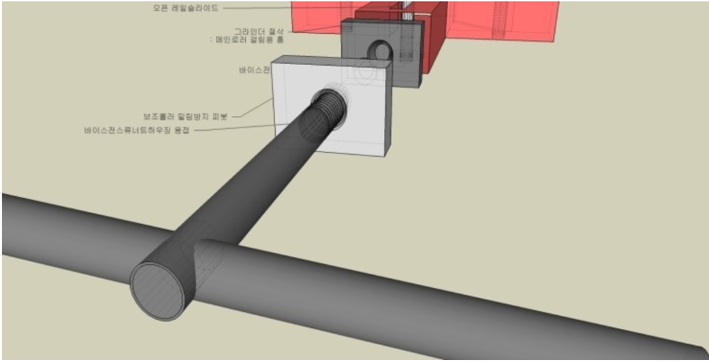 메인롤러의 매립슬라이딩 홈가공시에 메인롤러가 보조롤러의 몸체끝에 일치될정도의 거리를 재서 홈가공을 하면 됩니다 .