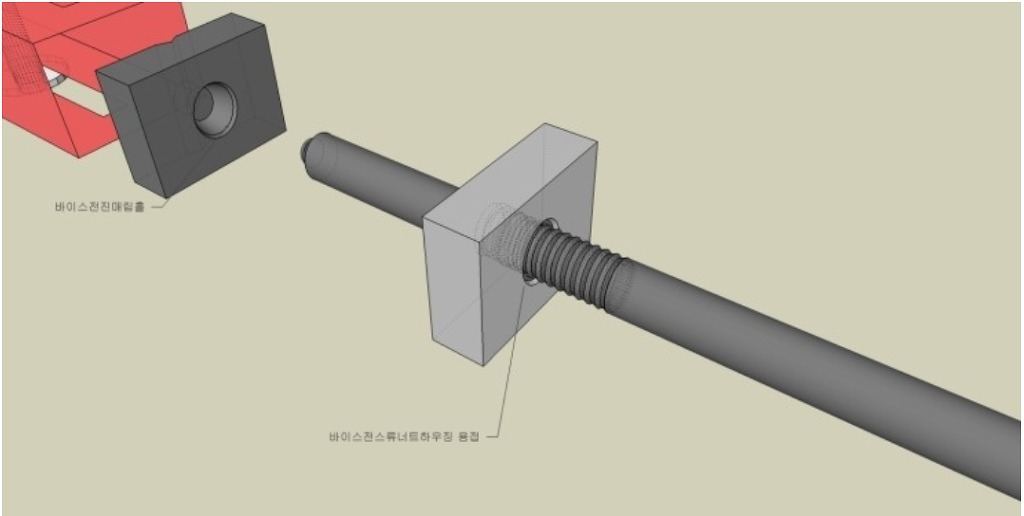작동이 잘되면 바이싱조우가 되는 알미늄블럭과 스크류너트를 함께 각관에 매립하여 밀어넣고서 스크류너트 사각으로 아까 가공공한 하우징을 각관테두리와 같이 용접합니다 .