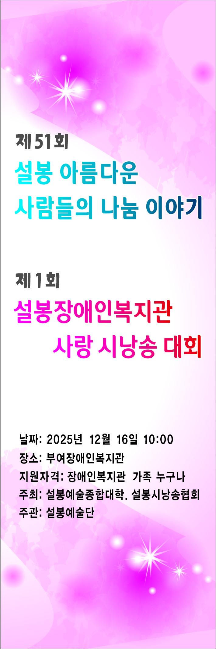 제1회 설봉장야인복지관 사랑시낭송대회 2025년 12월 16일 부여장애인복지관에서 개최 작성자사랑|작성시간25.12.13|조회수87 목록 댓글 0 글자크기 작게가 글자크기 크게가 다음검색 현재 게시글 추가 기능 열기 북마크 공유하기 신고 센터로 신고 댓글 댓글 0 댓글쓰기 댓글 리스트