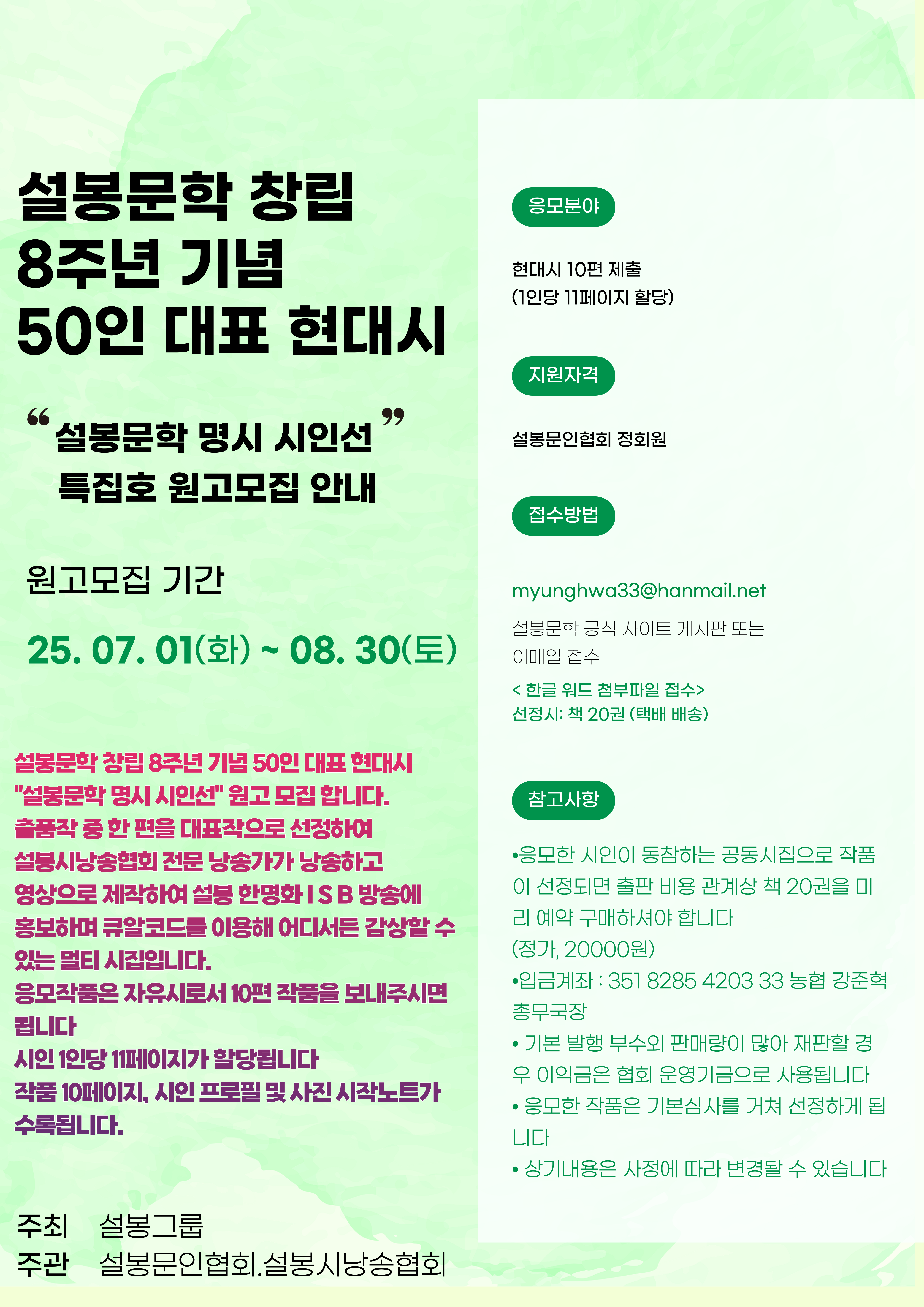 "설봉문학 명시 시인선" 원고 모집 합니다.