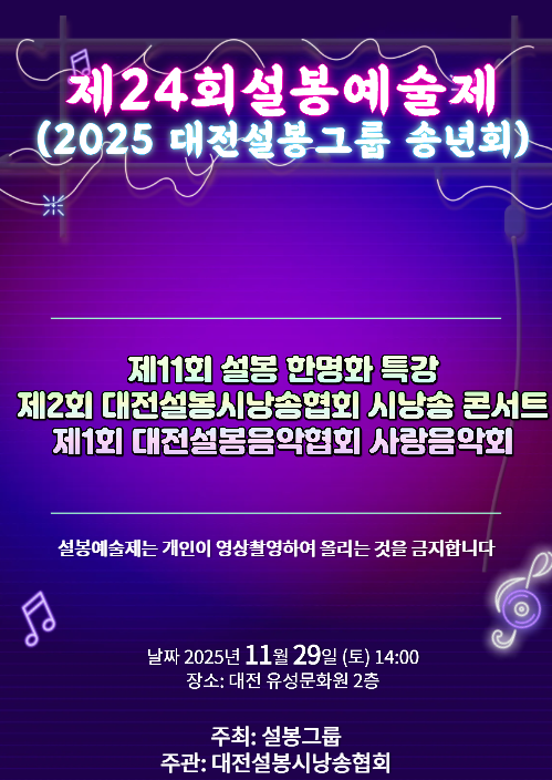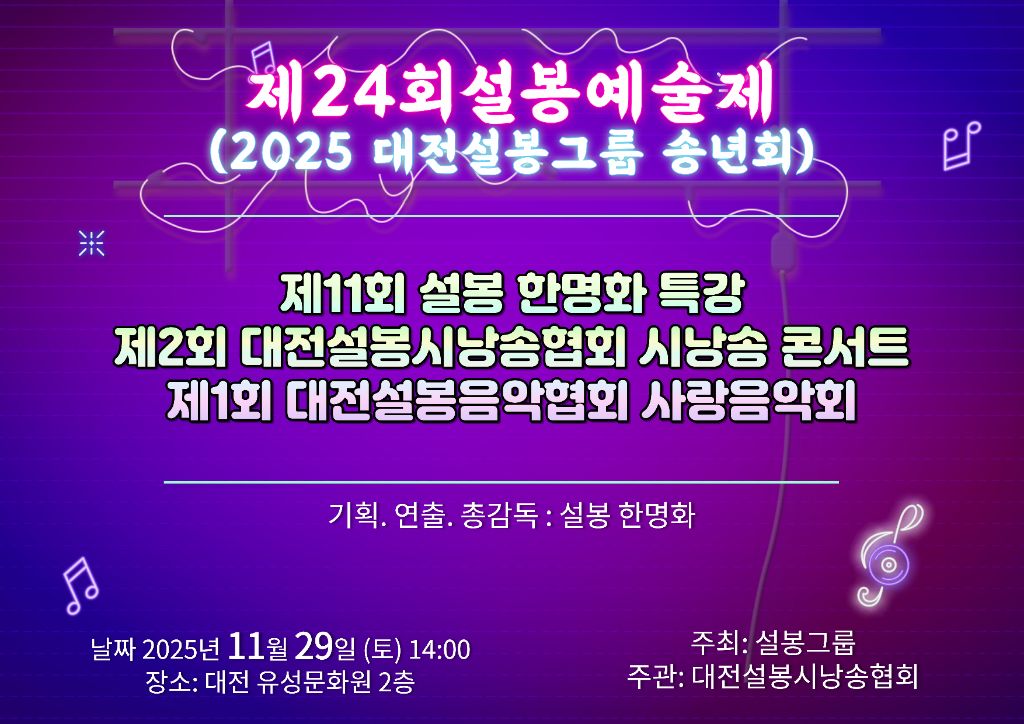 제24회 설봉예술제 / 2025년 대전설봉그룹 송년회 / 제11회 설봉 한명화 특강 / 제2회 대전설봉시낭송협회 시낭송 콘서트