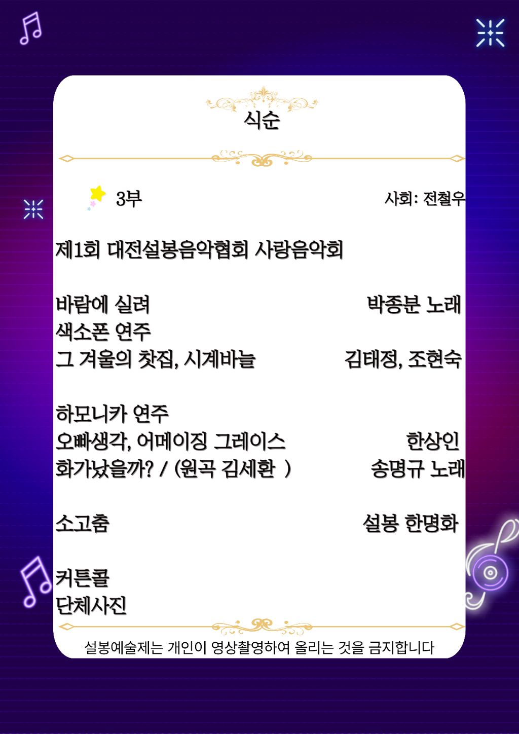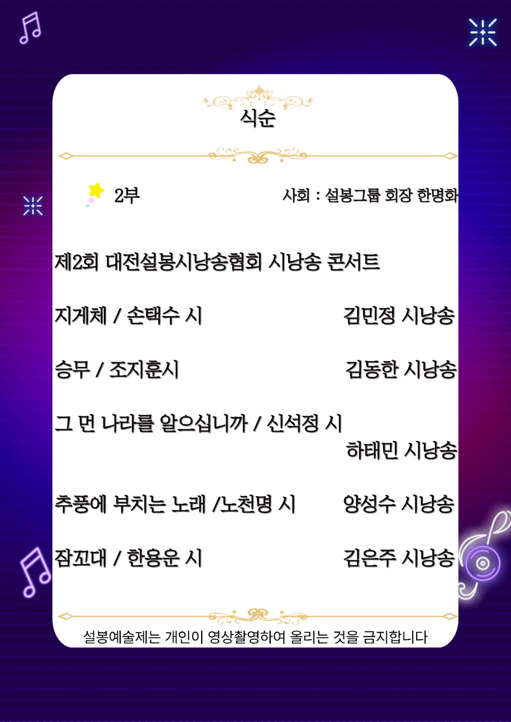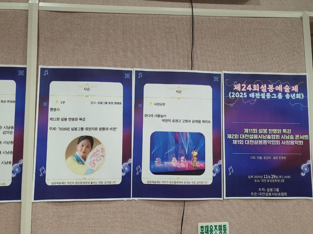 제24회 설봉예술제 성료 ( 대전 유성문화원 다목적실) 2025 11. 29(토) 주최: 설봉그룹 / 주관: 대전설봉시낭송협회 작성자사랑|작성시간25.12.01|조회수11 목록 댓글 0 글자크기 작게가 글자크기 크게가 다음검색 현재 게시글 추가 기능 열기 북마크 공유하기 신고 센터로 신고 댓글 댓글 0 댓글쓰기 답글쓰기 댓글 리스트