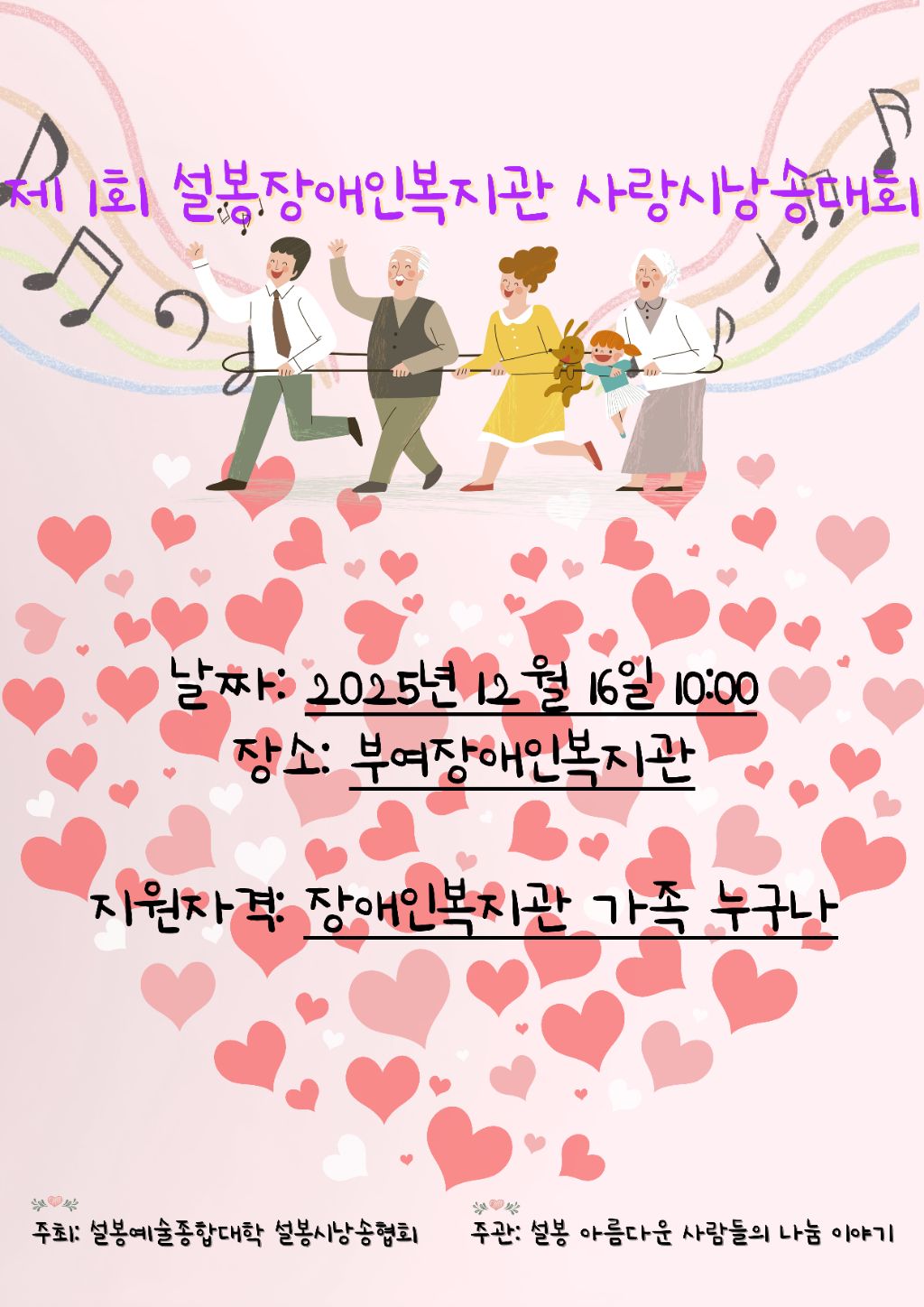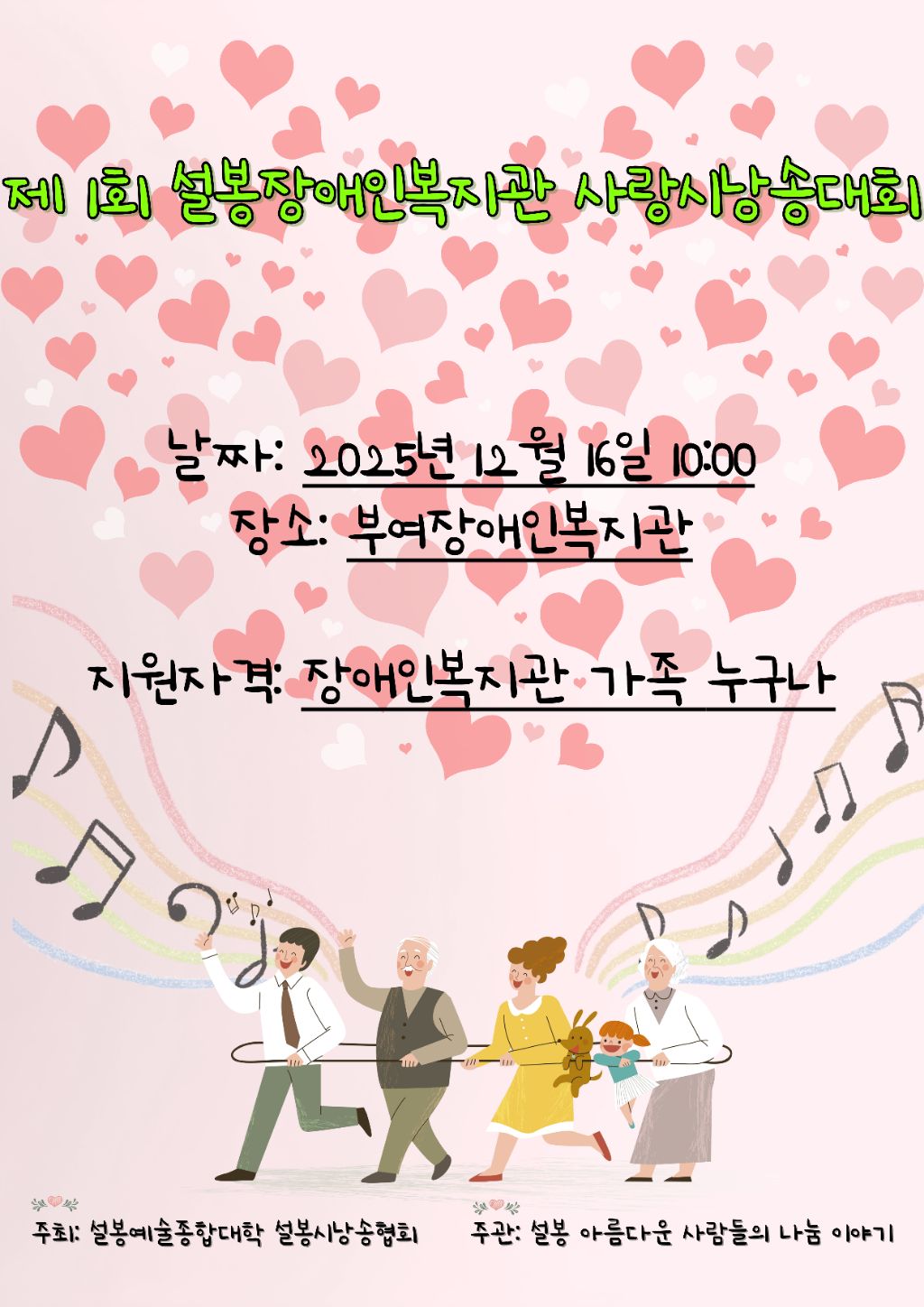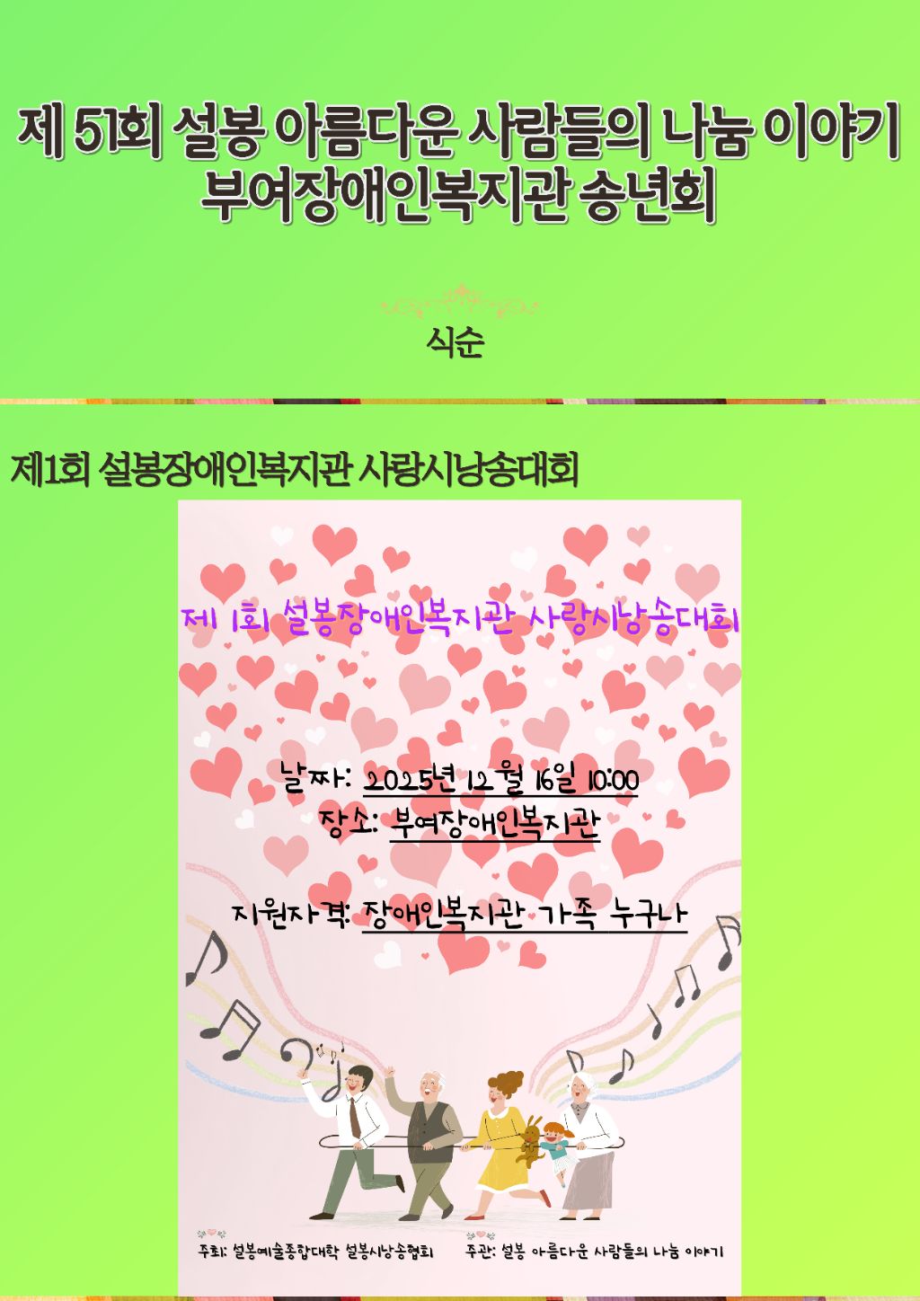 제51회 설봉 아름다운 사람들의 나눔 이야기 리플렛 / 제1회 설봉장애인복지관 사랑시낭송대회 개최 / 2025년 12월 16일 작성자사랑|작성시간25.12.16|조회수24 목록 댓글 0 글자크기 작게가 글자크기 크게가 제1회 설봉장애인복지관 사랑시낭송대회 개최제51회 설봉 아름다운 사람들의 나눔 이야기 다음검색 현재 게시글 추가 기능 열기 북마크 공유하기 신고 센터로 신고 댓글 댓글 0 댓글쓰기 답글쓰기 댓글 리스트