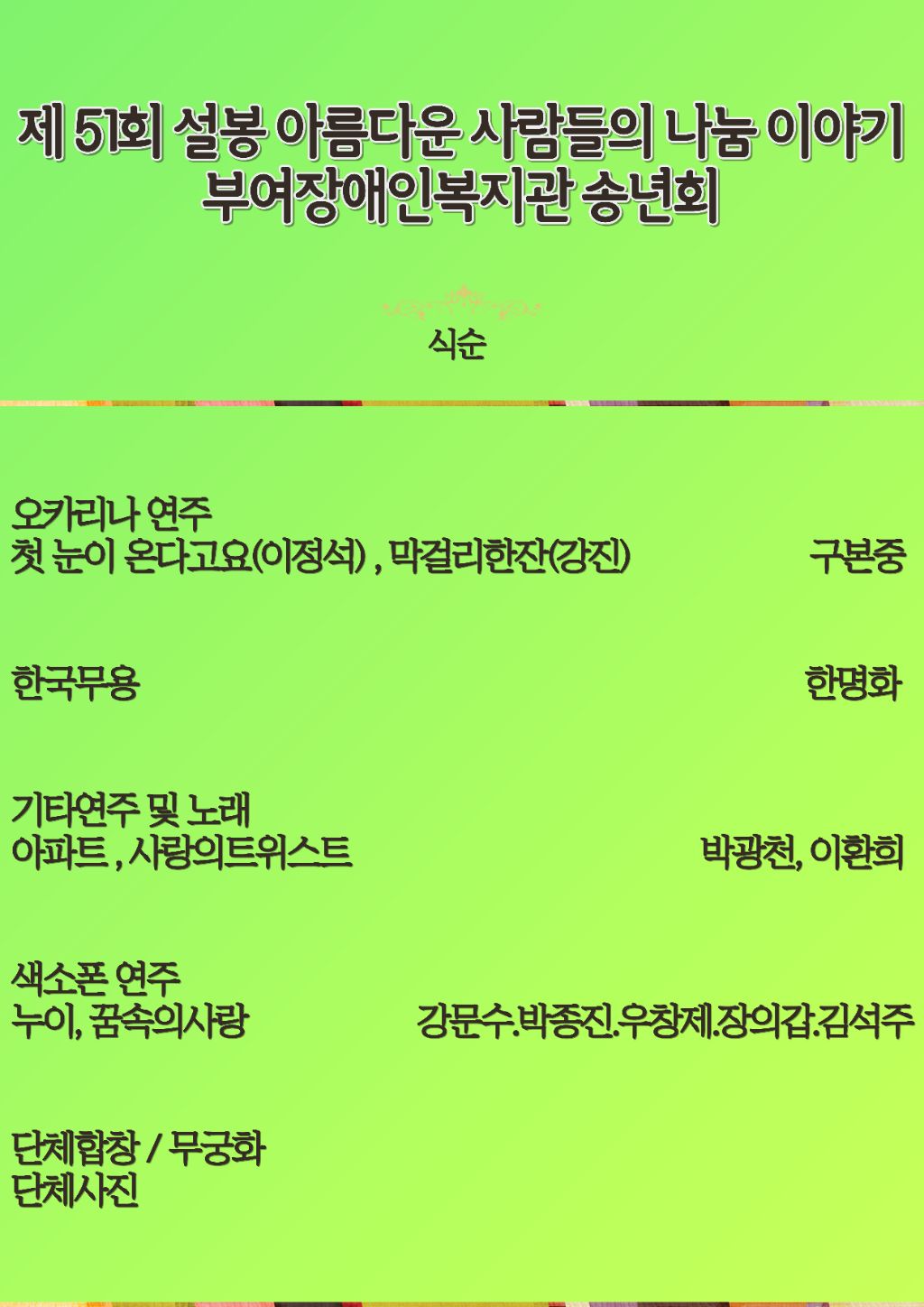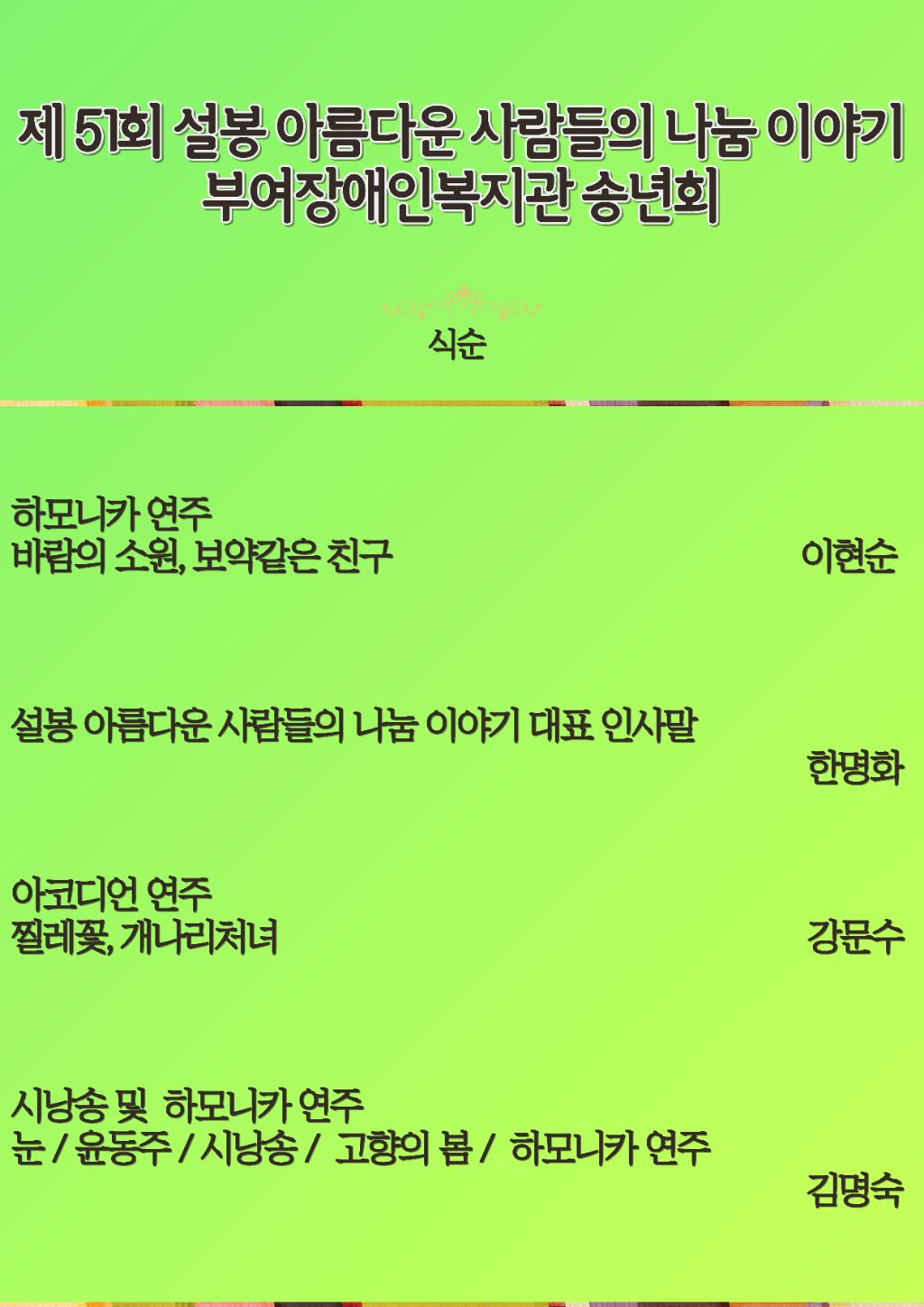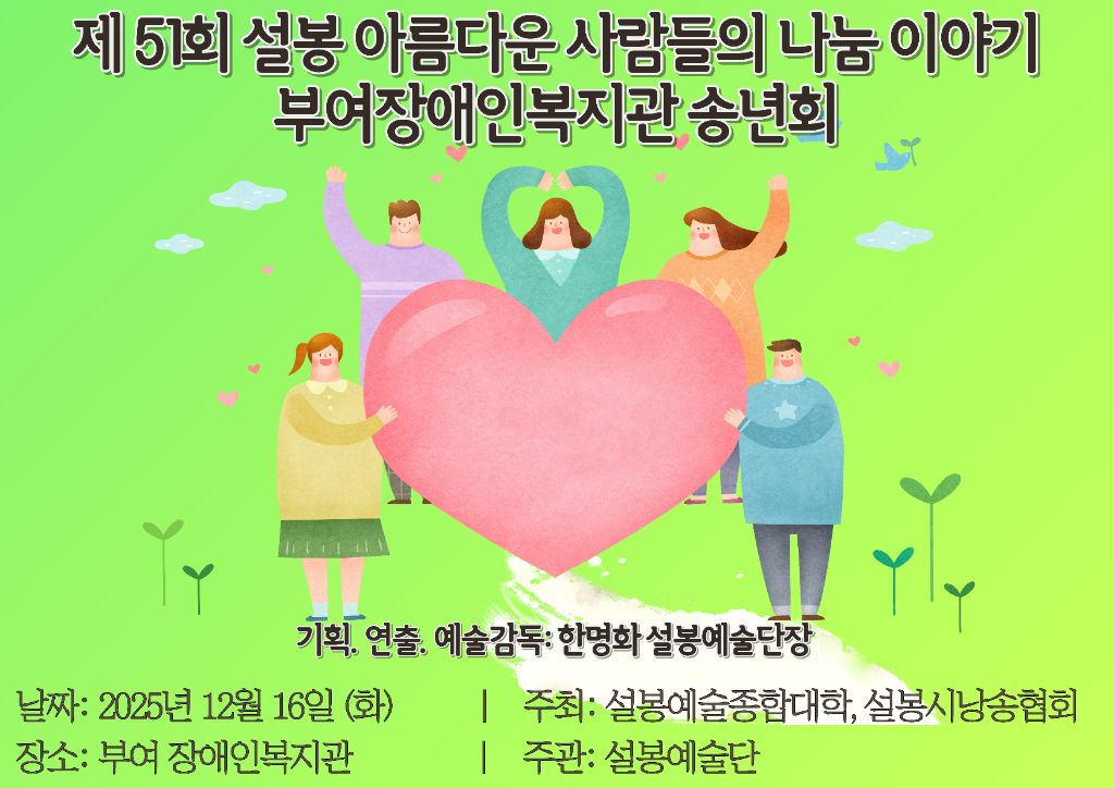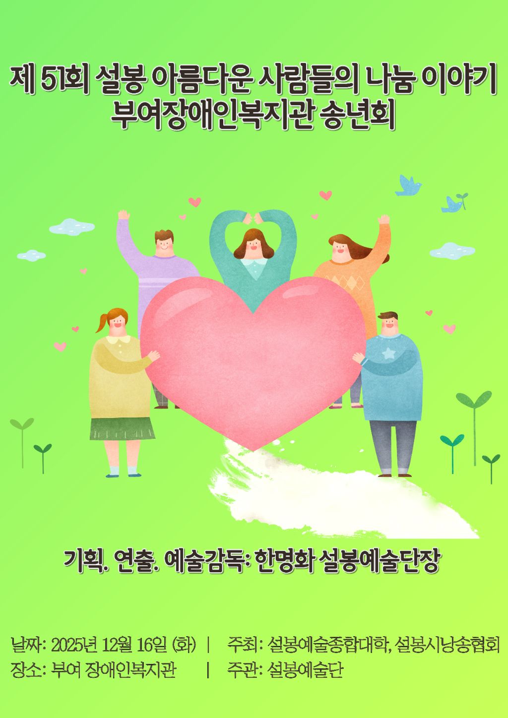 제51회 설봉 아름다운 사람들의 나눔 이야기 리플렛 / 제1회 설봉장애인복지관 사랑시낭송대회 개최 / 2025년 12월 16일 작성자사랑|작성시간25.12.16|조회수24 목록 댓글 0 글자크기 작게가 글자크기 크게가 제1회 설봉장애인복지관 사랑시낭송대회 개최제51회 설봉 아름다운 사람들의 나눔 이야기 다음검색 현재 게시글 추가 기능 열기 북마크 공유하기 신고 센터로 신고 댓글 댓글 0 댓글쓰기 답글쓰기 댓글 리스트
