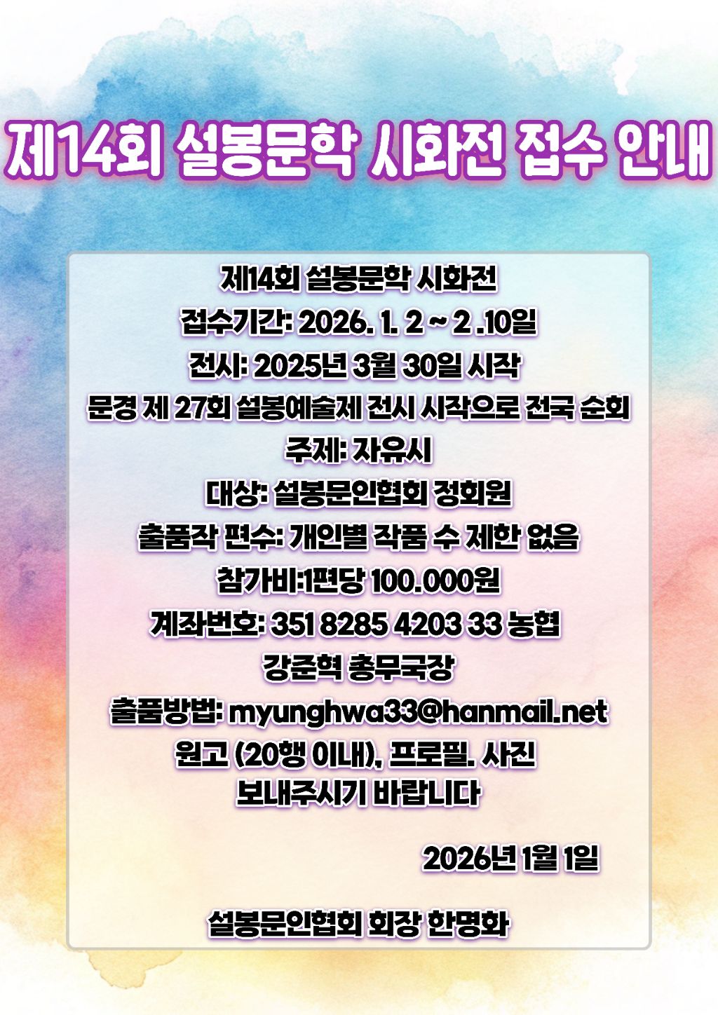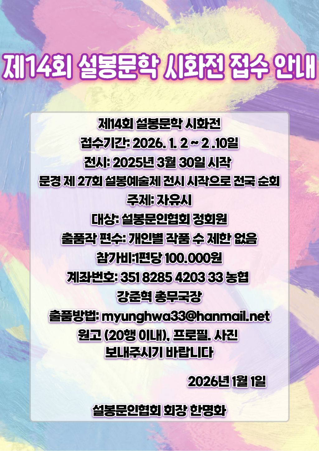 2026 제14회 설봉문학 시화전 전시안내 / 설봉문인협회 작성자사랑|작성시간26.01.22|조회수29 목록 댓글 0 글자크기 작게가 글자크기 크게가 #공지사항 https://youtube.com/shorts/55ErCw5GUaw?si=MV8qtzggtzpmpsq- 다음검색 현재 게시글 추가 기능 열기 북마크 공유하기 신고 센터로 신고 댓글 댓글 0 댓글쓰기 답글쓰기 댓글 리스트