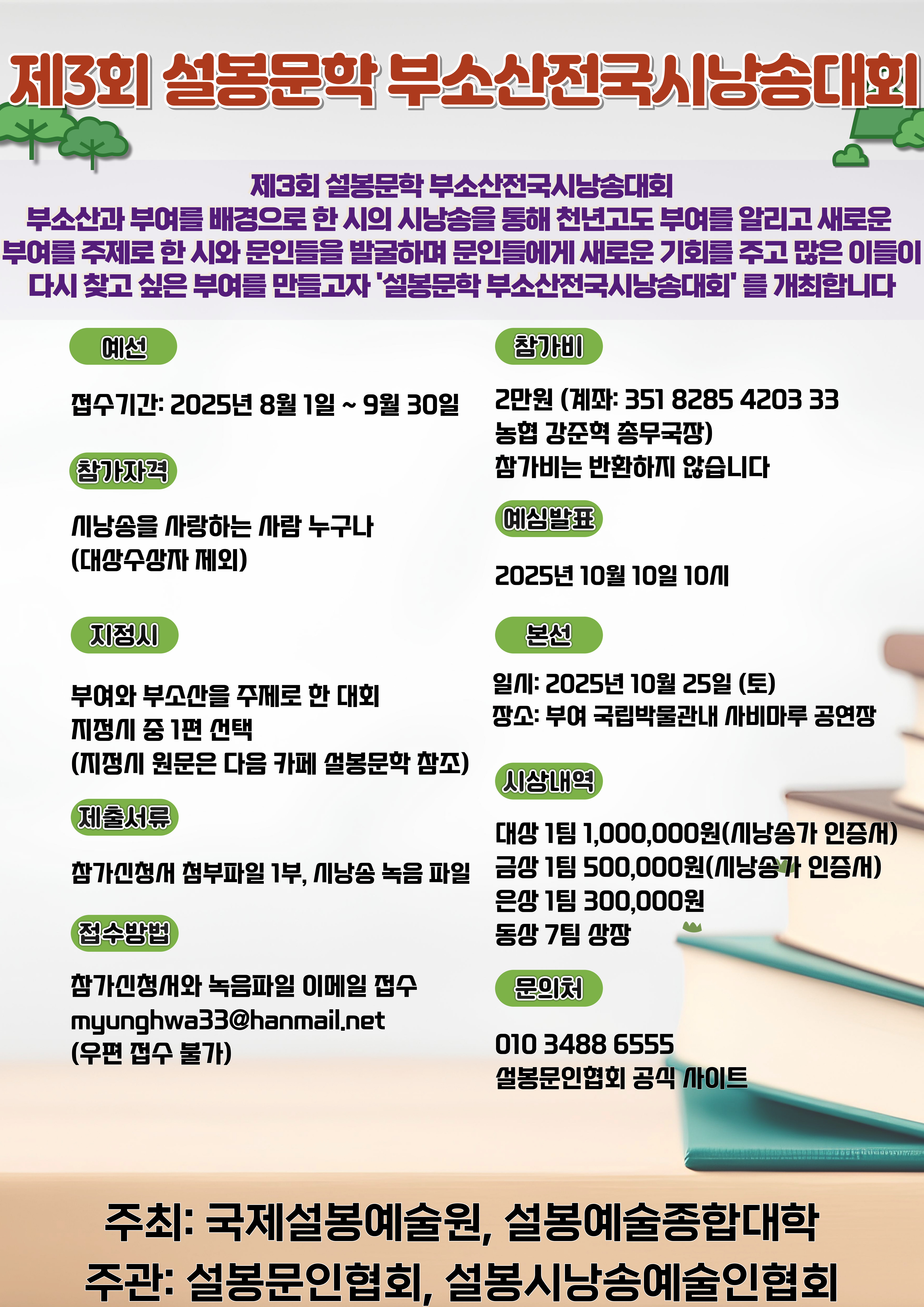 부소산과 부여를 배경으로 한 시의 시낭송을 통해 천년고도 부여를 알리고 새로운 부여를 주제로 한 시와 문인들을 발굴하며 문인들에게 새로운 기회를 주고 많은 이들이 다시 찾고 싶은 부여를 만들고자 '설봉문학 부소산전국시낭송대회' 를 개최합니다