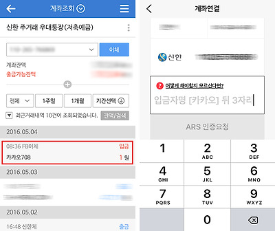 모바일 뱅킹앱으로 내 계좌를 조회해보면 진짜로 1원이 입금되어있는 것을 확인할 수 있다. 여기서 카카오708이라고 입금내역이 표기되어 있는데... '708' 3자리 숫자가 인증번호다. 각각 다르니 자신의 계좌 내역을 잘 보고 인증을 시도하도록 하자. 인증은 ARS 전화 추가 인증도 거쳐야한다. 보안은 늘 중요하다.