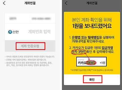 본인 이름과 휴대폰 번호, 그리고 계좌번호를 입력하고 '계좌 인증요청'을 하면, 카카오머니에 있던 1원이 해당 계좌로 입금된다. 이 입금내역에 쓰여져 있는 3자리 숫자를 조회해서 기억한뒤 카카오톡 앱으로 돌아와서 입력하면 인증이된다. 토스(Toss)나 네이버페이도 비슷한 인증방식을 가지고 있는데, 1원을 준다는 점에서 토스와 매우 유사한 방식이다. (여담이지만 네이버는 후하게 100원 정도를 준다)