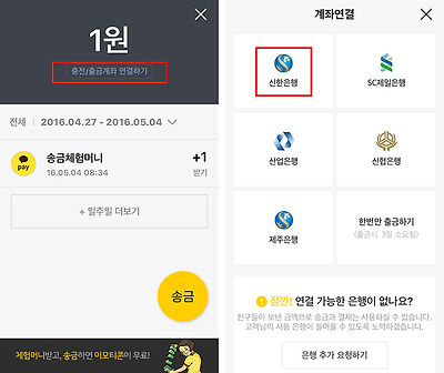 카카오머니에 1원이 충전된다. 이제 이 1원을 받기위해 내가 사용하는 주거래은행 계좌를 연결시켜야한다. 기자는 신한은행과 SC은행을 사용중이라 신한은행을 연결시켰다. 참고로 지금은 신한, 스탠다드차다드은행, 산업은행, 신협은행, 제주은행 계좌를 연결할 수 있다.