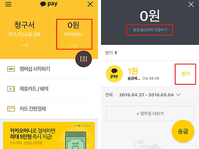 여기서 처음 사용한다면 0원이라고 쓰여져 있는 카카오머니 메뉴를 클릭하자. 그리고 '충전/출금계좌 연결하기'나 카카오가 보내준 돈 1원을 '받기'를 눌러 내 은행계좌 연결하고 인증 절차를 진행하는 것이 가능하다. 도중에 6자리 숫자 비밀번호를 설정해야 하는 것도 잊지말자.