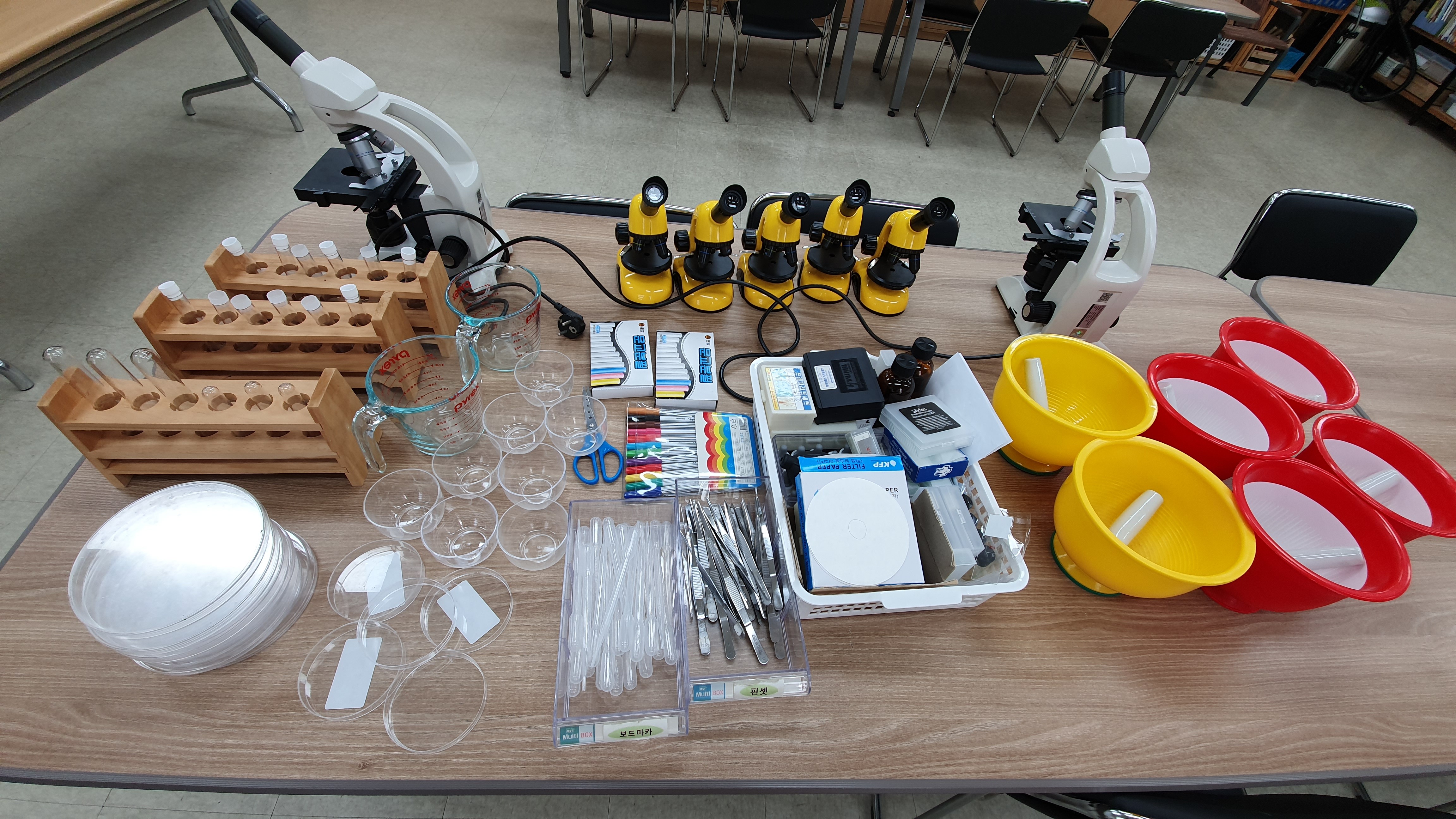 광학현미경, 실체현미경, 어린이현미경 등을 준비해