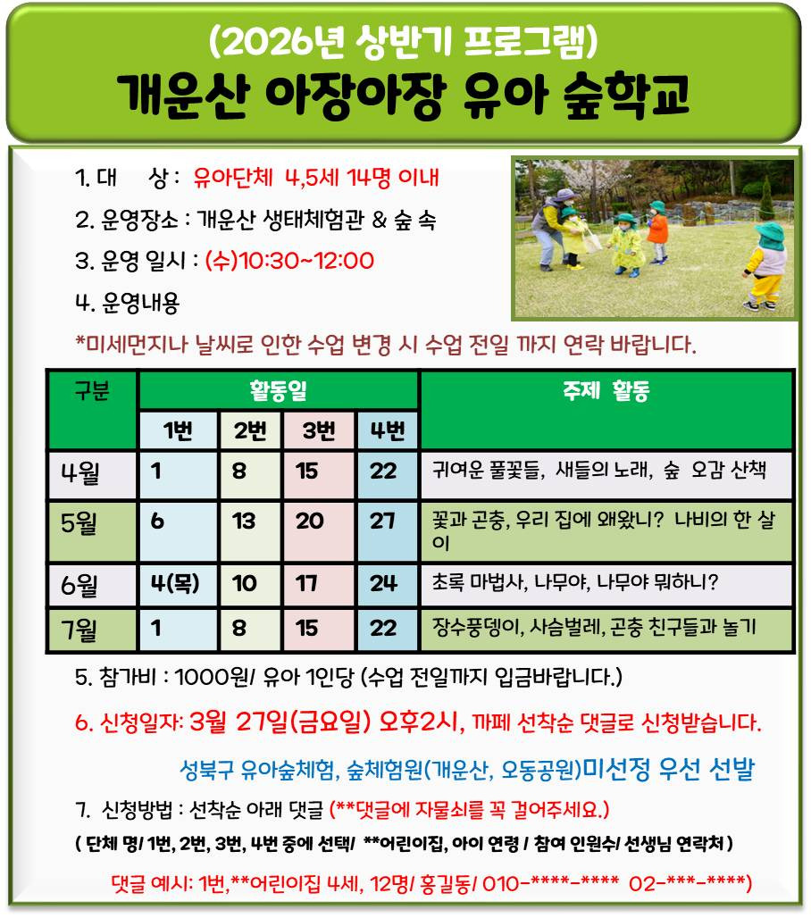 [연속]2026년 상반기 개운산 아장아장 유아숲학교_오전10시30분_유아 4~5세 기관 단체 대상 작성자카페매니저|작성시간26.03.10|조회수412 목록 댓글 48 글자크기 작게가 글자크기 크게가 1주차베베OO10시 30분2주차다O10시 30분3주차eOOOO10시4주차예다O10시 다음검색 현재 게시글 추가 기능 열기 북마크 공유하기 신고 센터로 신고 댓글 댓글 48 댓글쓰기 답글쓰기 댓글 리스트 해당 댓글은 작성자와 운영진만 볼 수 있습니다. 해당 댓글은 작성자와 운영진만 볼 수 있습니다. 해당 댓글은 작성자와 운영진만 볼 수 있습니다. 해당 댓글은 작성자와 운영진만 볼 수 있습니다. 해당 댓글은 작성자와 운영진만 볼 수 있습니다. 댓글 전체보기