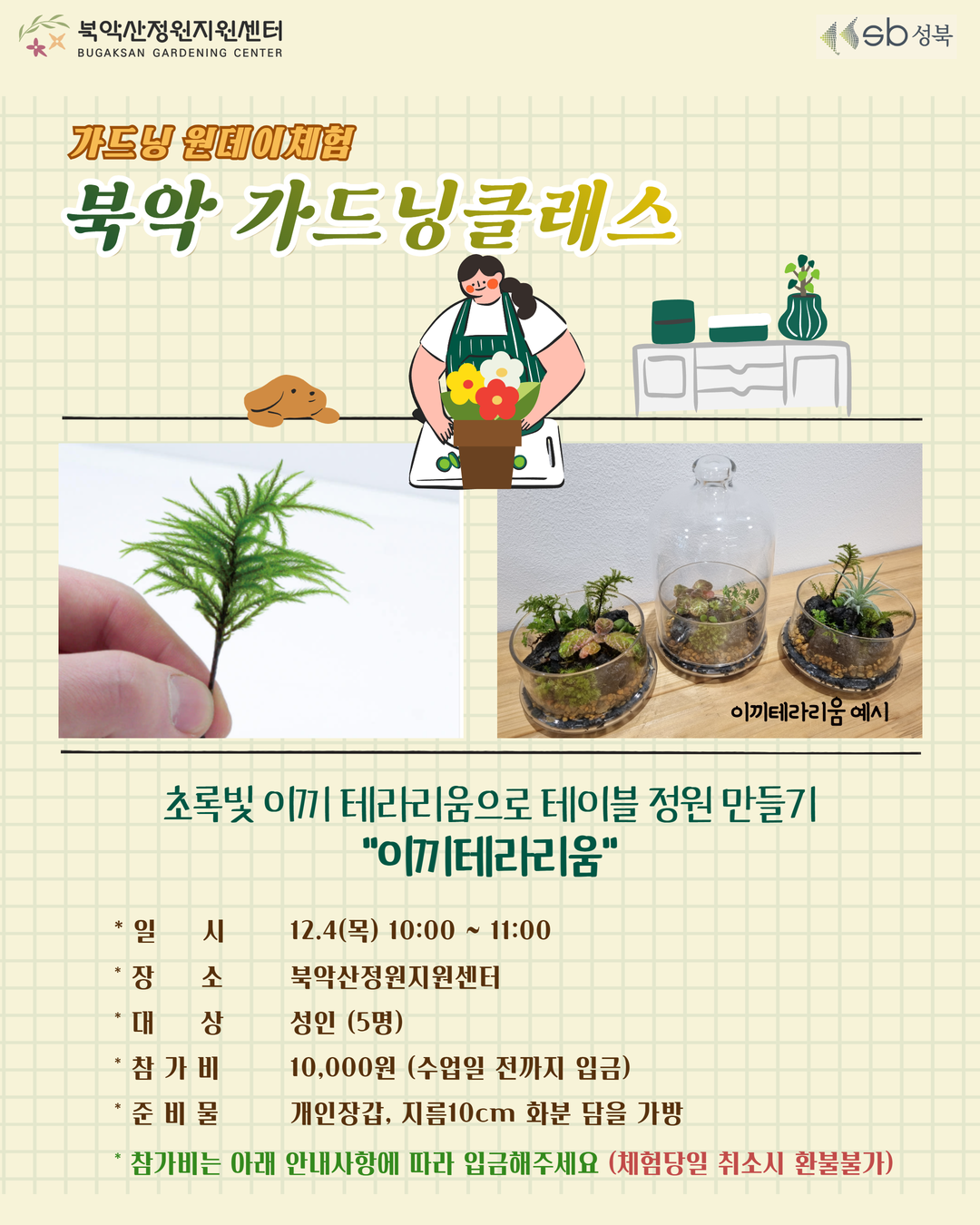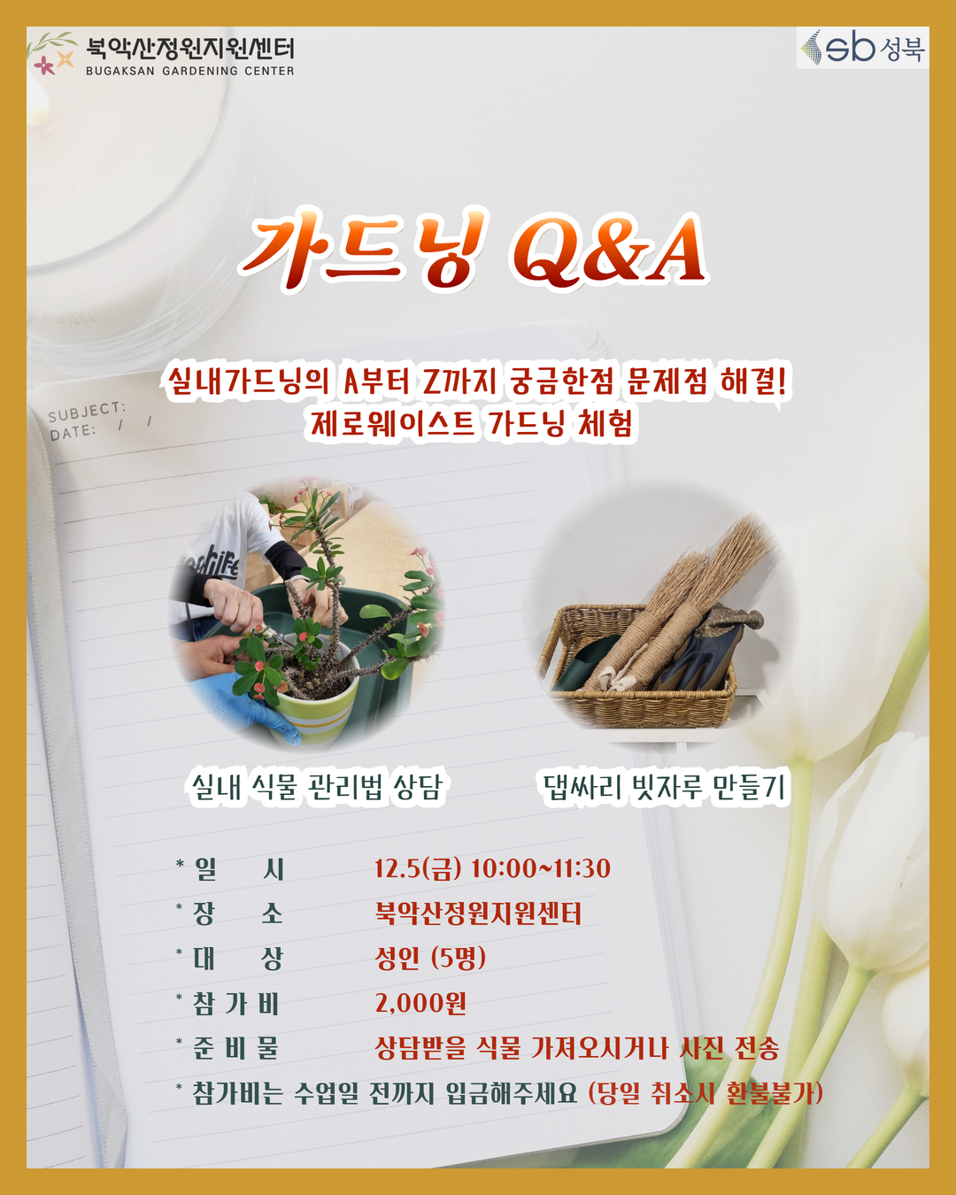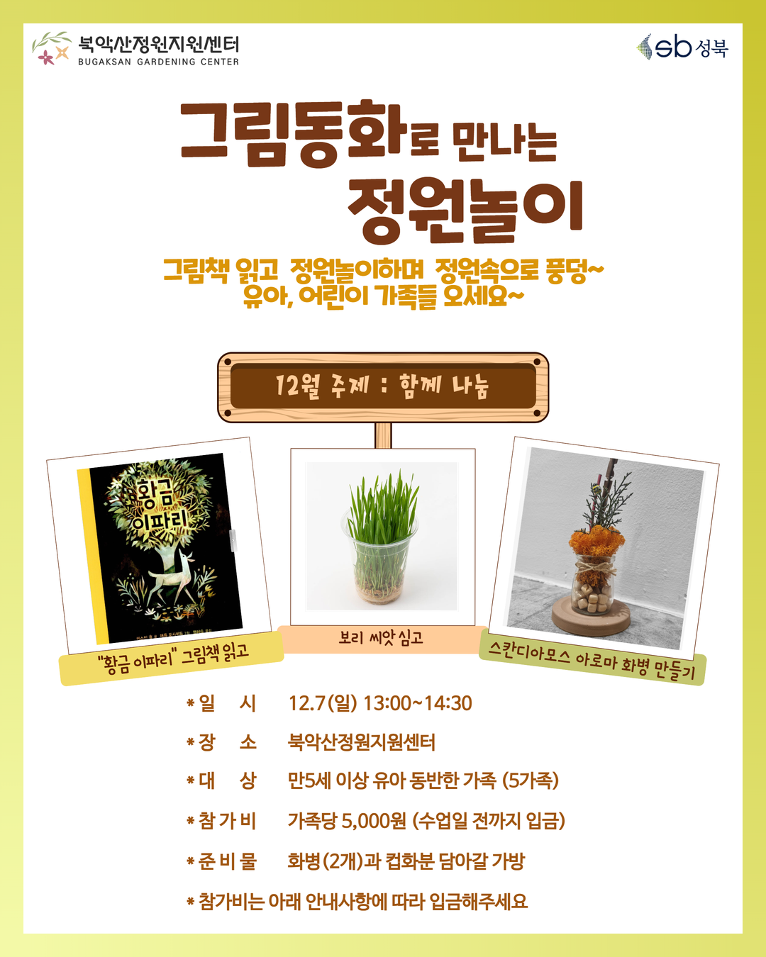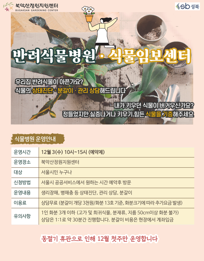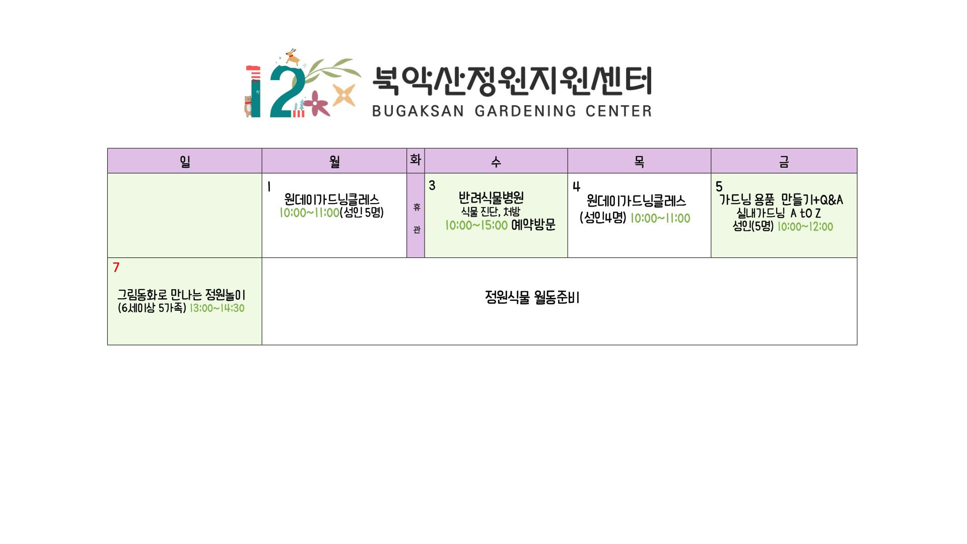 [2025년 12월]북악산 정원지원센터 프로그램 작성자카페매니저|작성시간25.11.28|조회수80 목록 댓글 0 글자크기 작게가 글자크기 크게가 11월 28일 금요일 접수 가능합니다 통합검색 | 서울특별시 공공서비스예약검색창에 "북악산정원지원센터"으로 검색하세요 다음검색 현재 게시글 추가 기능 열기 북마크 공유하기 신고 센터로 신고 댓글 댓글 0 댓글쓰기 답글쓰기 댓글 리스트