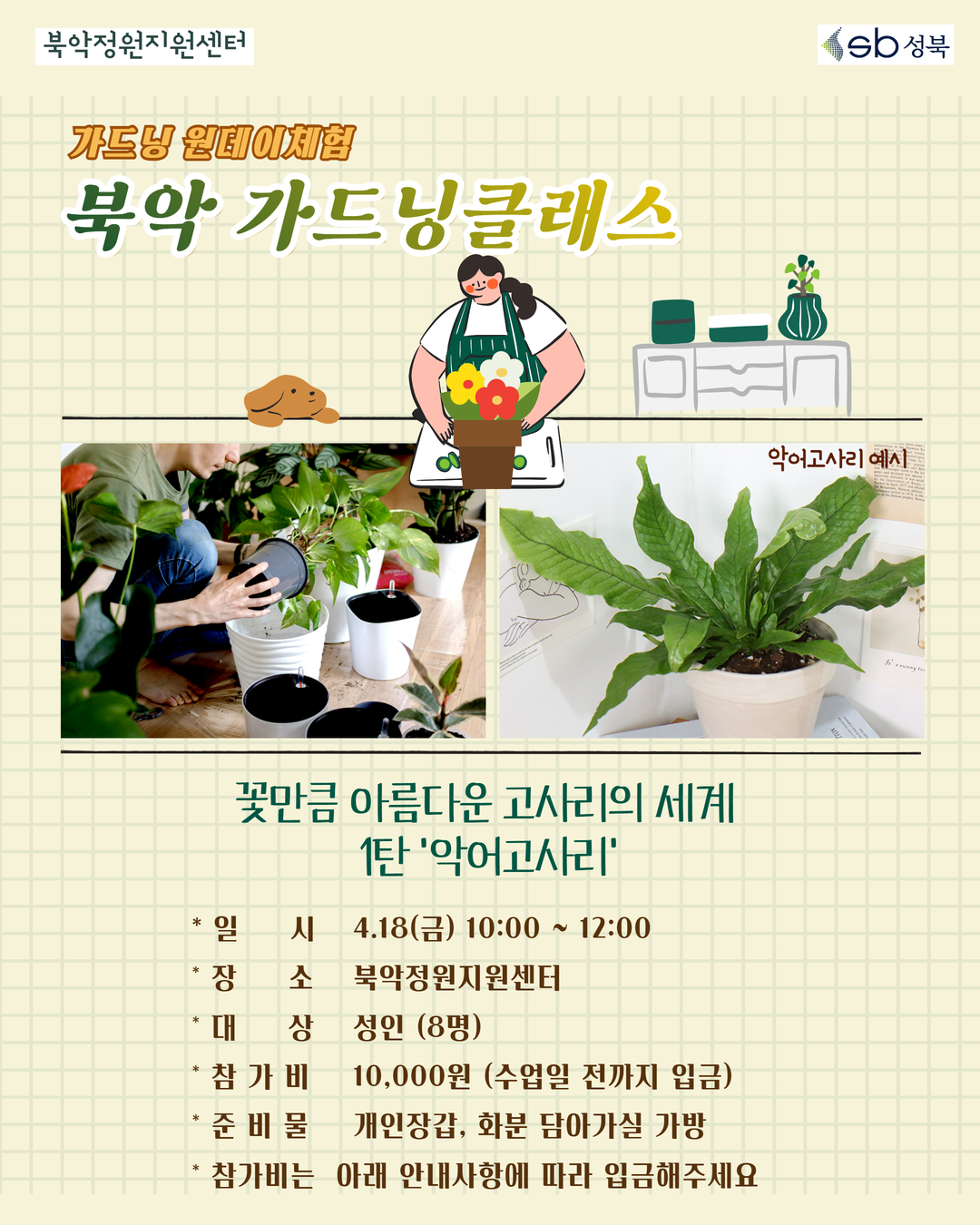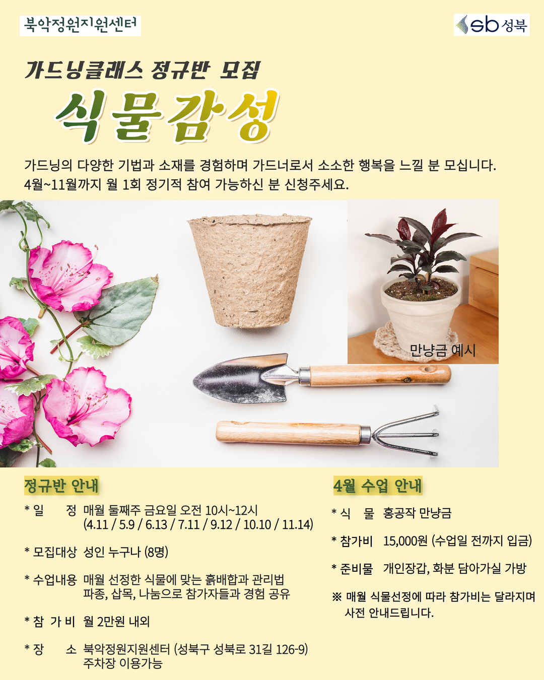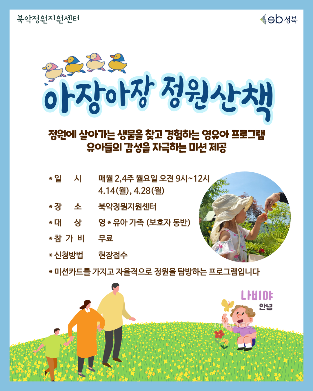 [2025년4월]북악산 정원지원센터 프로그램을 안내합니다 작성자카페매니저|작성시간25.03.31|조회수212 목록 댓글 0 글자크기 작게가 글자크기 크게가 북악산 정원지원센터가 개관되었습니다4월 프로그램 신청은 4월 2일 오전 9시서울시 공공서비스예약에서 접수 받습니다서울특별시 공공서비스예약서울특별시 공공서비스예약한번에 쉽게 간편하게 서울특별시 공공서비스예약yeyak.seoul.go.kr 다음검색 현재 게시글 추가 기능 열기 북마크 공유하기 신고 센터로 신고 댓글 댓글 0 댓글쓰기 답글쓰기 댓글 리스트