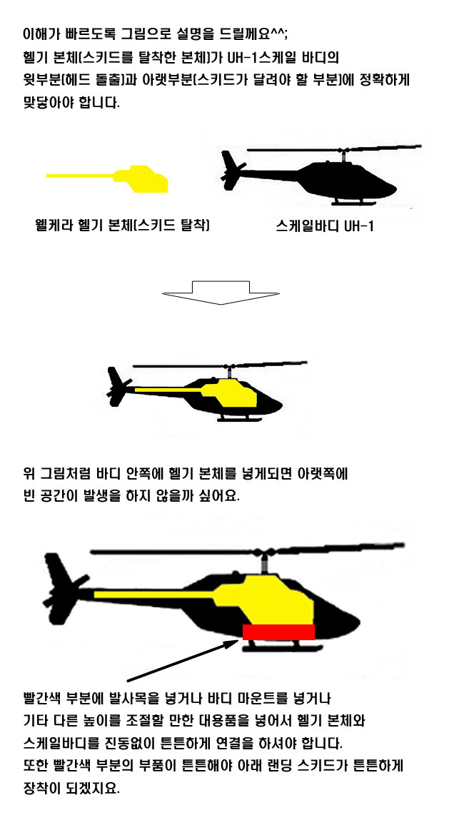 헬기에 맞게 생산되어진 스케일바디를 씌우는게 가장 좋을듯하구요.(무게 / 안정성 / 정비성)