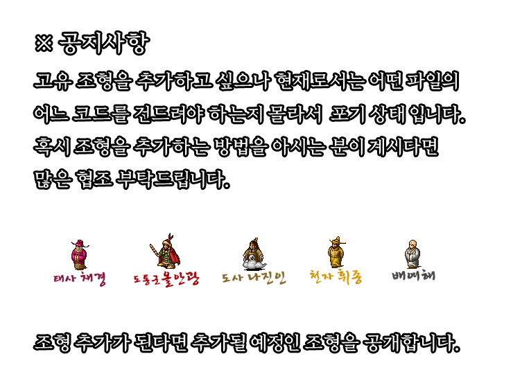 작성자누스 작성시간 14.08.21 예전 수호지 처음할때는 한다는게 무뢰한 능력치 수정정도였는데 이젠 새 무뢰한을 만들어서 넣을 정도라니 ㅋㅋ 조형도 기대됩니다.