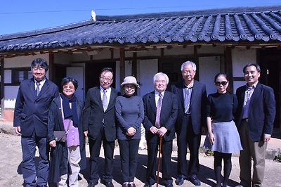 17일 전남 장흥에서 열린 ‘제6회 이청준문학제’에서 김주연 한국문학번역원장(왼쪽에서 세번째)과 김병익 문학평론가(다섯번째)가 이청준 선생 생가에서 기념촬영을 하고 있다. | 문학과지성사 제공