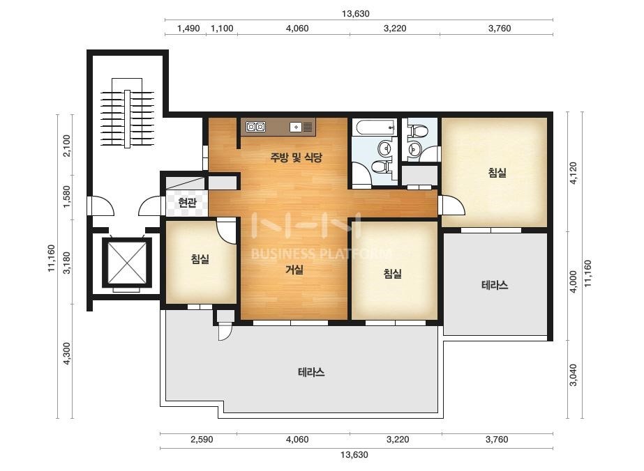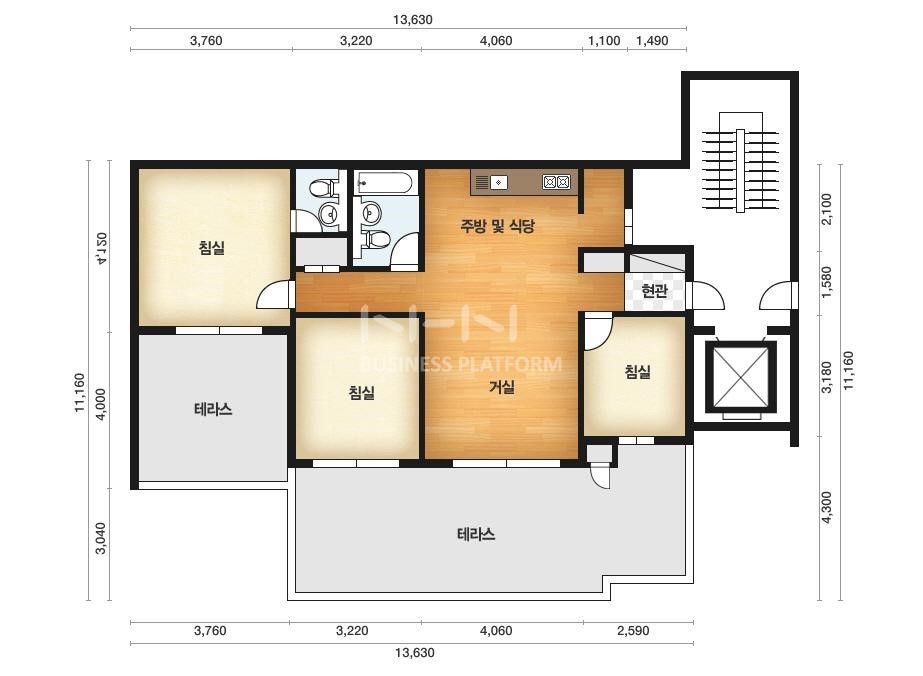 기존의 탑상형 아파트는 각 실의 향이 달라 일반적으로 거실과 안방이 남향이나 전망이 좋은 위치에 자리한다. 각 실의 환경을 균등하게 만들기 위한 방안으로 각 영역의 일자형 배치를 제안하고자 한다.