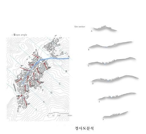 위의 경사도와 지형분석을 토대로 안창마을을 이룰 블록의 형태나 유닛의 조합방식은 현재 부산시에서 내걸고 있는 경사지를 절토하여 만들어내는 탑상형 아파트의 모습이 아닌 저층집합주거의 모습이 이 마을을 유지시키고 가꾸는 방법이 될 것이다.
