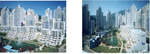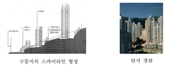 구릉지의 연속적인 스카이라인을 형성하고있으며 구릉지 경관형성과 단지 주택내에서 조망권을 최대한 확보하도록 하고있다. 판상형의 주동배치를 가급적 최소화하고 타워형과 주동의 분절을 통해 피노라마적인 도시경관을 형성하였다.