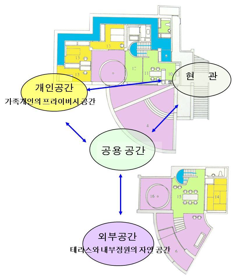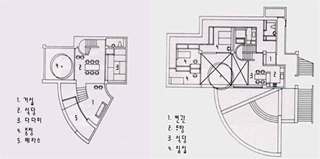 ▶ 가장 위에는 프라이버시가 중요한 방이나 입구에서 가까이에 위치 해야할 부엌이 위치하고 내려올수록 사람들이 모일 수 있는 장소가 생겨난다.