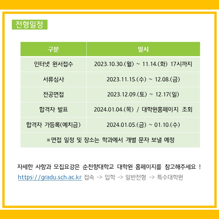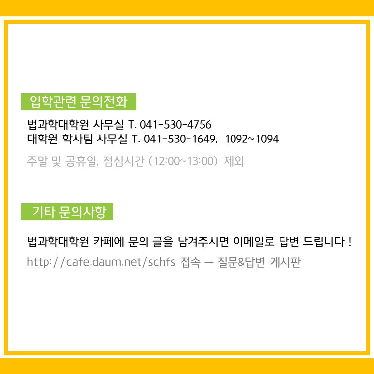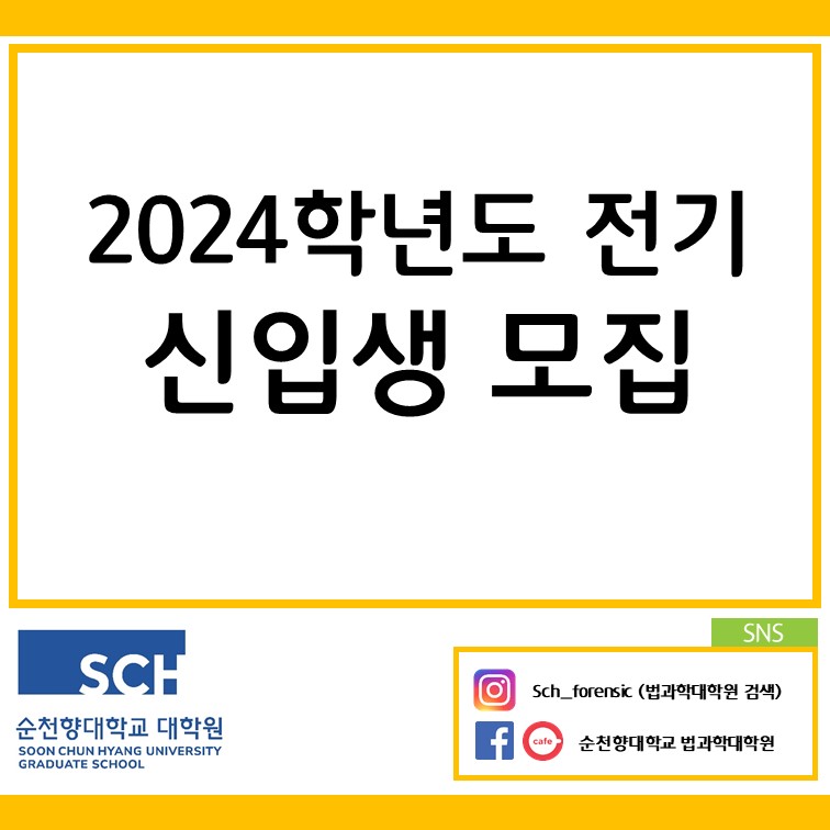 ※ 2024학년도 전기 법과학대학원 신입생 모집 안내 ※ 작성자이예진0510|작성시간23.10.19|조회수699 목록 댓글 0 글자크기 작게가 글자크기 크게가 안녕하세요 법과학대학원입니다.2024학년도 전기 법과학대학원 신입생 모집요강 안내드립니다.모집요강 파일은 순천향대학교 대학원 홈페이지에서도 확인이 가능합니다.감사합니다. 다음검색 현재 게시글 추가 기능 열기 북마크 공유하기 신고 센터로 신고 댓글 댓글 0 댓글쓰기 답글쓰기 댓글 리스트