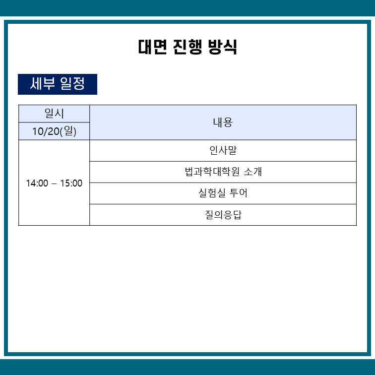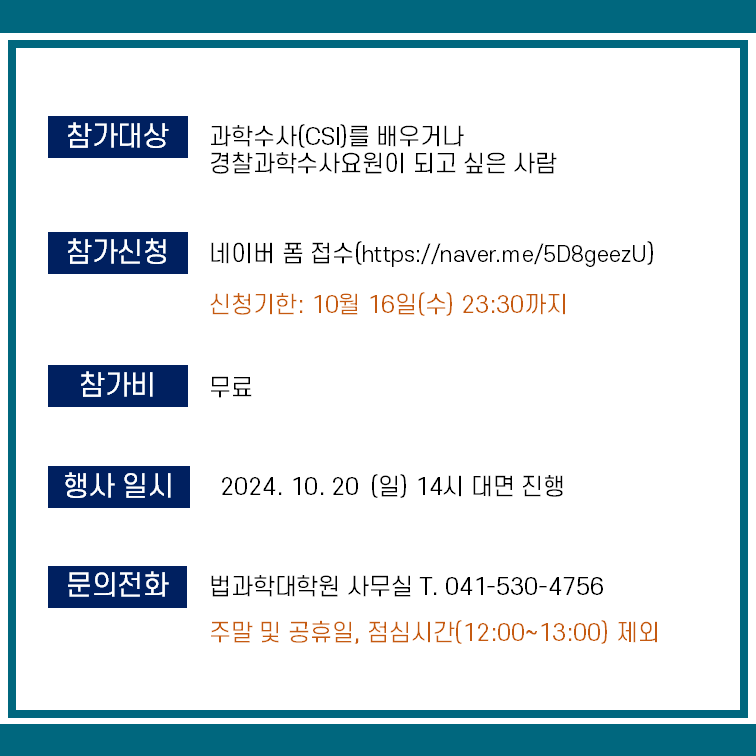 안녕하세요. 국내 최고의 과학수사 전문 교육기관 순천향대학교 법과학대학원입니다. 법과학대학원에서 '2025학년도 입학설명회'를 개최하오니 관심 있는 분들의 많은 참여 바랍니다. 신청 기한은 10.16.(수) 23:30까지이니 참고해주시기 바랍니다.