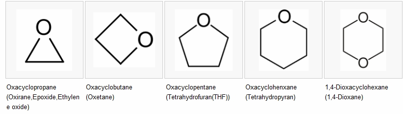 IUPAC 명명법 : 줄기 고리가 단일 결합으로 구성된 경우만을 고려하면, 고리를 구성하는 탄소와 산소 수를 모두 합하여서 옥사시클로알칸(oxacycloalkane)으로 명명한다. 여기서 접두사 옥사(oxa)는 시클로 알칸(cycloalkane)에서 탄소가 산소로 치환된 것을 나타낸다.고리에 연결된 치환기를 명명할 때에는, 고리에 있는 산소 원자에서부터 번호를 붙인다.