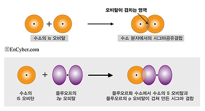 플루오린화수소에서는 수소 원자의 1s 오비탈과