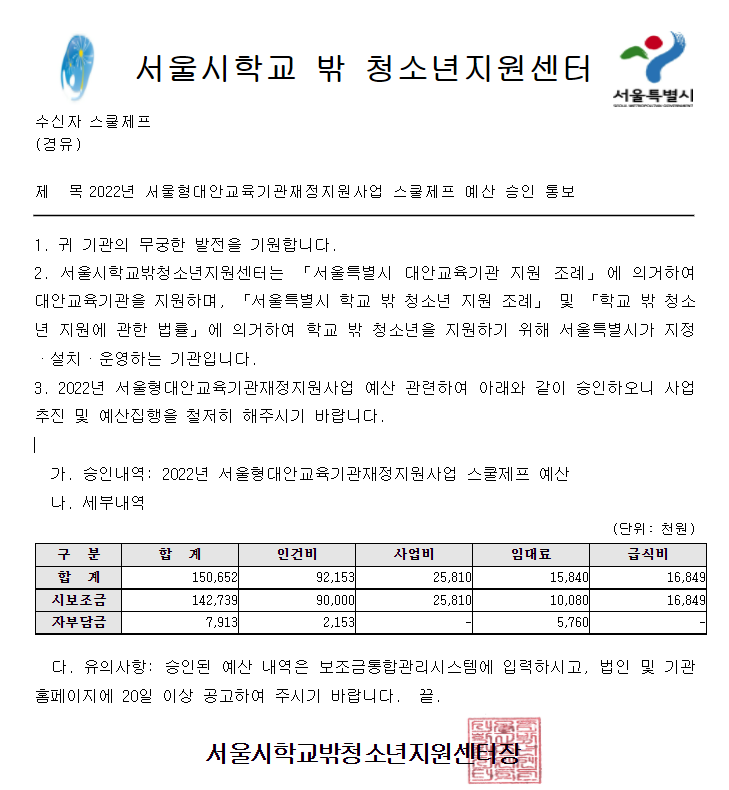 2022 제프 서울형 징검다리 거점공간 예산 승인 공고 작성자제프|작성시간22.03.23|조회수77 목록 댓글 0 글자크기 작게가 글자크기 크게가 [공문]2022년 서울형대안교육기관재정지원사업 스쿨제프 예산 승인 통보.hwp313.50KB 첨부파일첨부된 파일이 2개 있습니다. png 파일 2022 스쿨제프 예산 승인 통보.png 다운로드 hwp 파일 [공문]2022년 서울형대안교육기관재정지원사업 스쿨제프 예산 승인 통보.hwp 다운로드 다음검색 현재 게시글 추가 기능 열기 북마크 신고 센터로 신고 댓글 댓글 0 댓글쓰기 답글쓰기 댓글 리스트