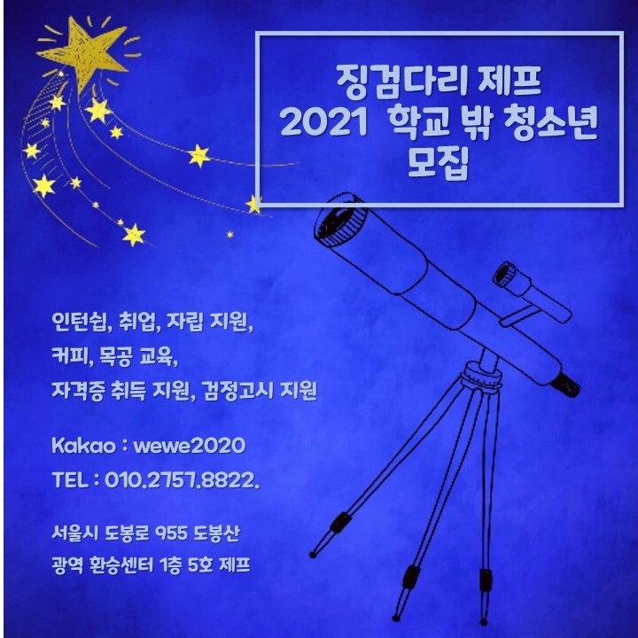 서울시 학교 밖 청소년 지원센터의 지원을 받는 서울시 도봉구에 위치한 징검다리 거점공간 스쿨제프입니다.