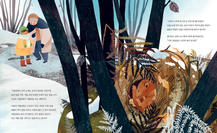 소년은 할머니와 겨울 숲속을 거닐며 동물들이 어디에서 겨울잠을 자고 있는지 둘러봤어요. 소년이 좋아하는 겨울잠쥐는 나무에 둥근 둥지를 만들고는 따듯한 봄볕이 비출 때까지 잠을 잤지요. 동물들은 나무 안, 땅속, 연못 아래 진흙 바닥 속, 동굴 안 등 숲속 곳곳에서 저마다의 방식으로 잠을 자고 있었지요. 이렇게 제각각 독특한 방식으로 추운 겨울을 이겨 내는 동물들을 보며 우리는 추운 겨울을 이겨 내게 하는 겨울잠이 동물들에게 얼마나 아늑할지 알게 되어요. 그리고 자연의 섭리가 마법처럼 신비롭게 느껴지면서 자연의 위대함을 다시금 깨닫게 되지요.